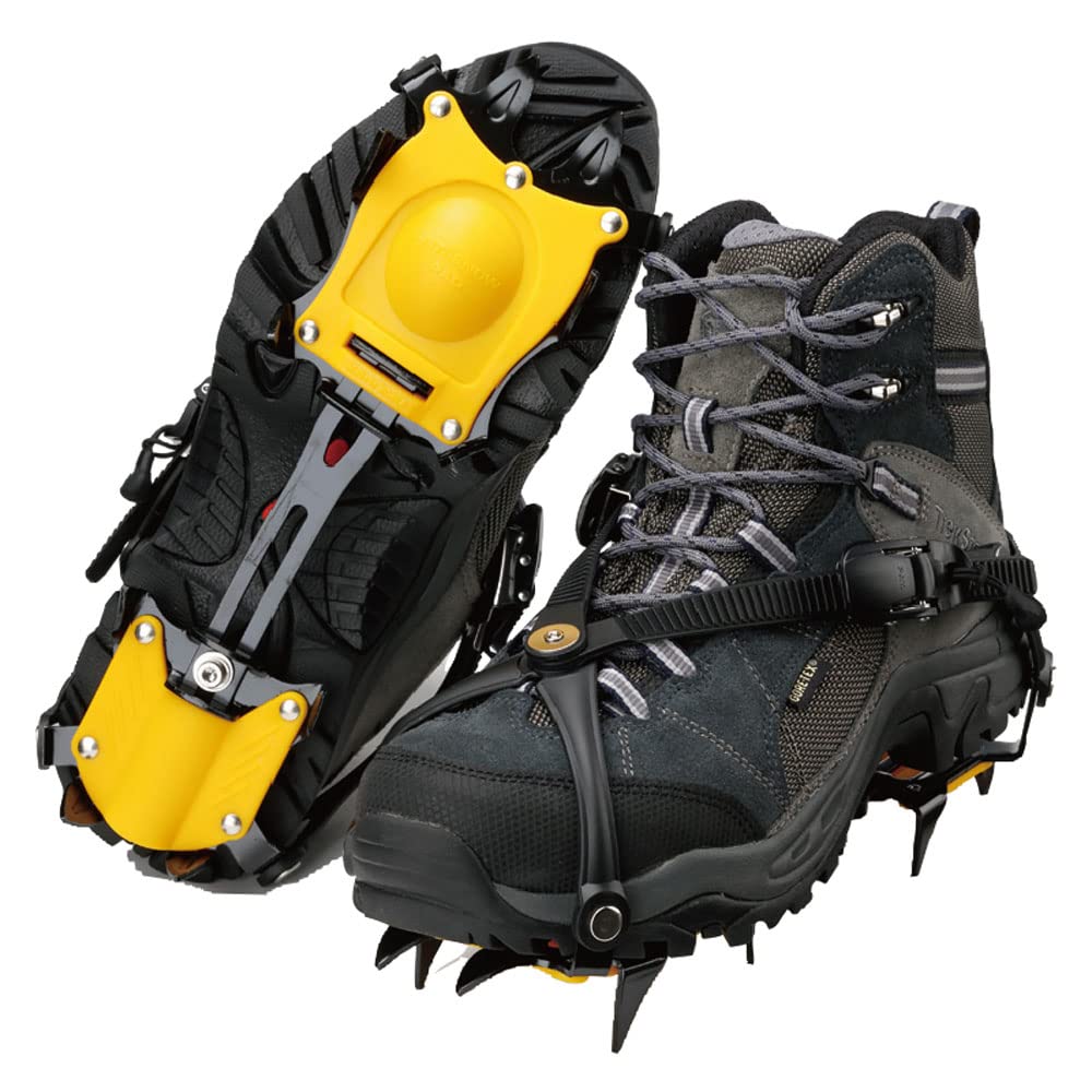 冬山トレッキング用の10本爪アイゼン。Vクロスバンド・2バックルシステムで着脱が簡単スムーズです。誤挿入防止機能付きのワンタッチバックルシステムや靴をしっかりと固定する前後スタビライザー、雪だんごを解消するスノープレートなどで足元を安全にサポートします。