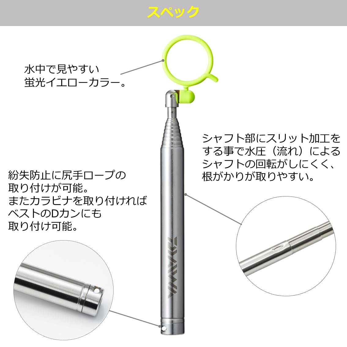 シャフト部にスリット加工をする事で水圧(流れ)によるシャフトの回転がしにくく、根掛りトラブル解消に便利。 リング部は折り畳み可能でコンパクトに!ベストのポケットに収納可能(胸ポケットのサイズにより収納できない場合がある)