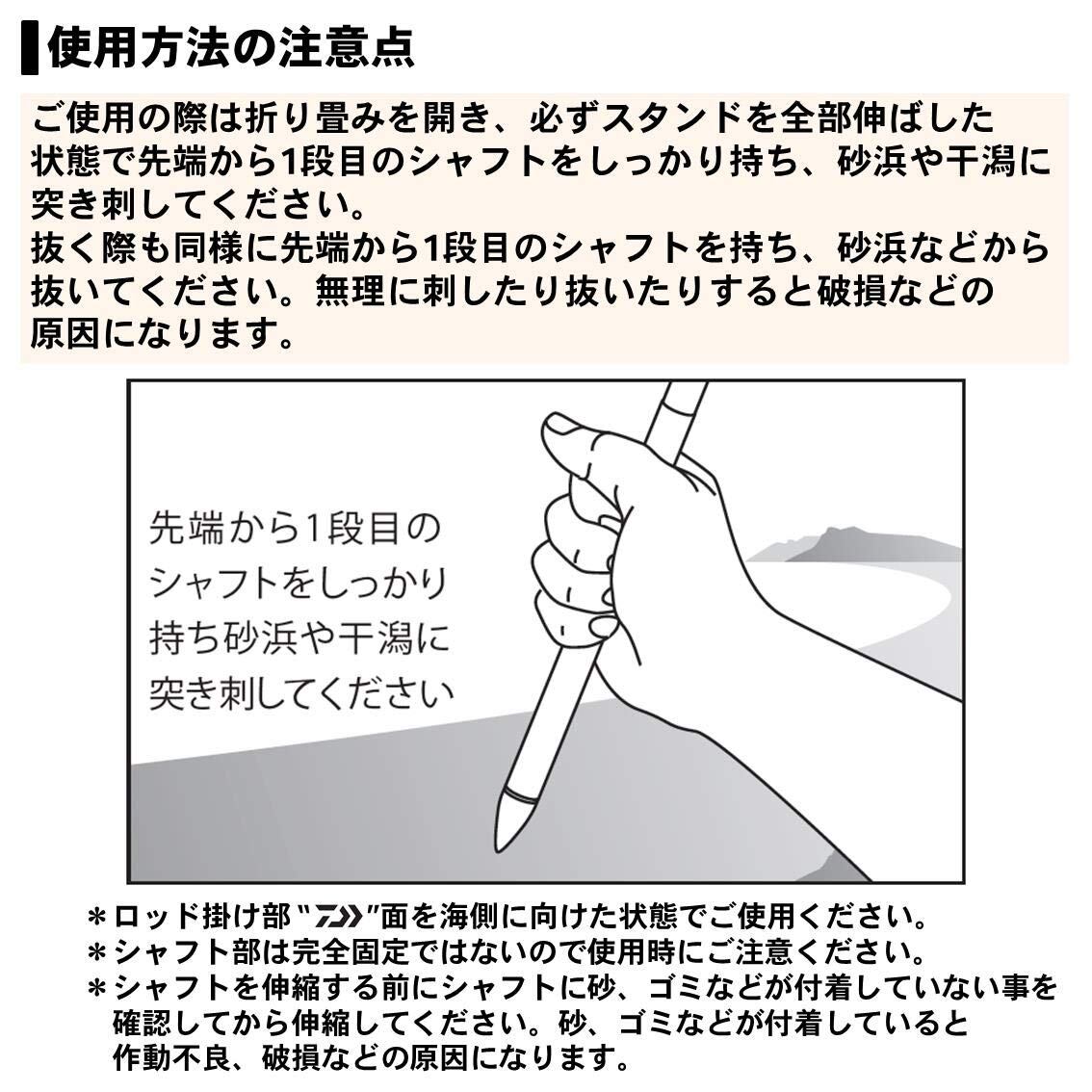 鋭い先端加工でサクッと砂に差し込み可能。(※先端部が鋭いので取り扱いには十分ご注意のうえ、使用しない時は保護チューブを被せてください。)