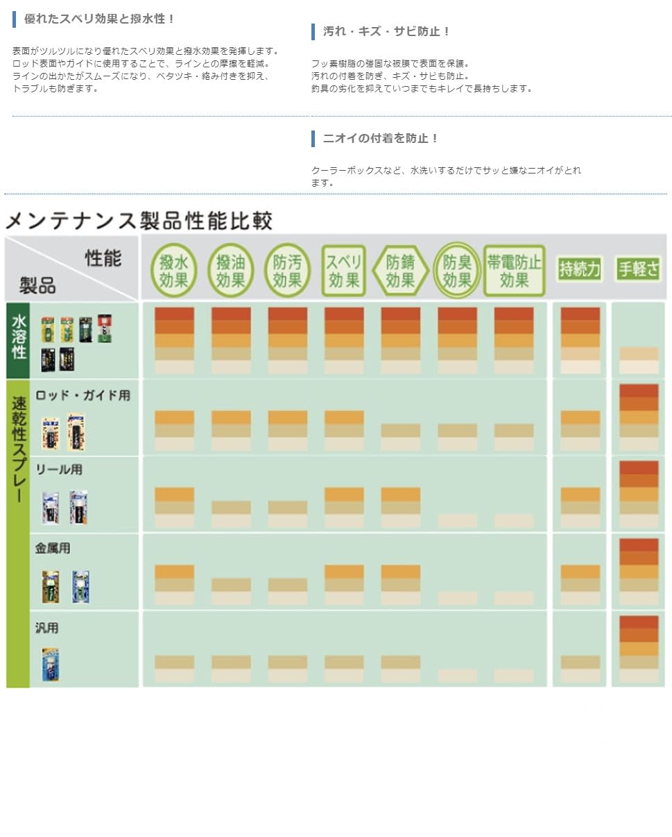 容量:50g 形体:乳液(要拭き取り) 用途:ロッド、クーラーボックス、などプラスチック・金属・ガラス製品の表面保護に汎用的に利用可能。 特徴: ■少量でも無駄なく使える乳液タイプ。 ■優れたスベリ効果と撥水性! 表面がツルツルになり優れたスベリ効果と撥水効果を発揮します。 ロッド表面やガイドに使用することで、ラインとの摩擦を軽減。 ラインの出かたがスムーズになり、ベタツキ・絡み付きを抑え、 トラブルも防ぎます。 ■汚れ・キズ・サビ防止! フッ素樹脂の強固な被膜で表面を保護。 汚れの付着を防ぎ、キズ・サビも防止。 釣具の劣化を抑えていつまでもキレイで長持ちします。 ■ニオイの付着を防止! クーラーボックスなど、水洗いするだけでサッと嫌なニオイがとれます。