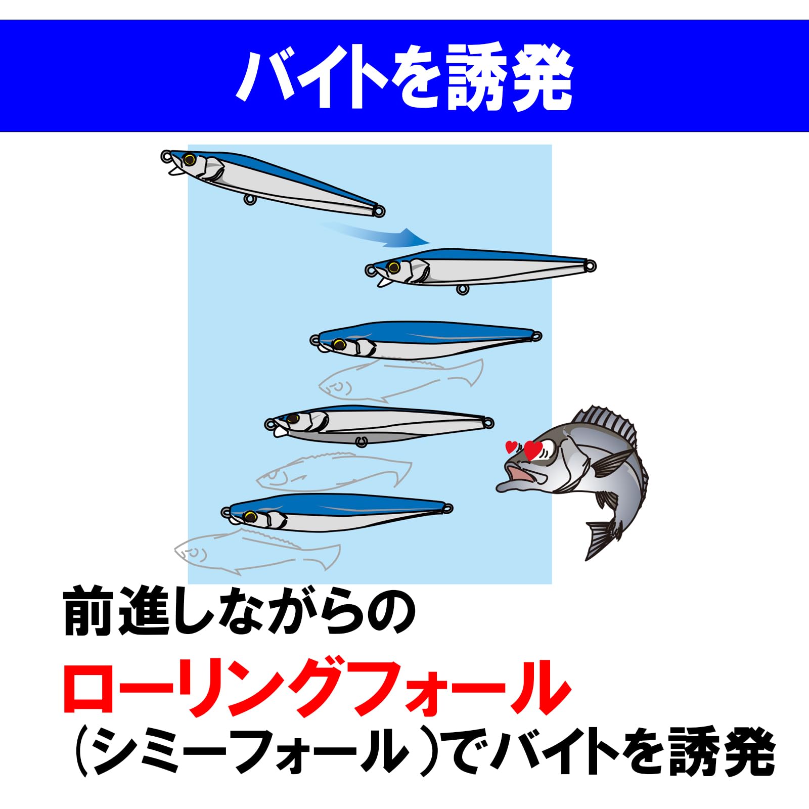 ■極小リップがしっかり水を掴んで、水面直下のハイスピードリトリーブができる!■バイトを誘発する前進しながらのローリングフォール(シミーフォール)。■逆風でも負けない圧倒的な遠投性能。