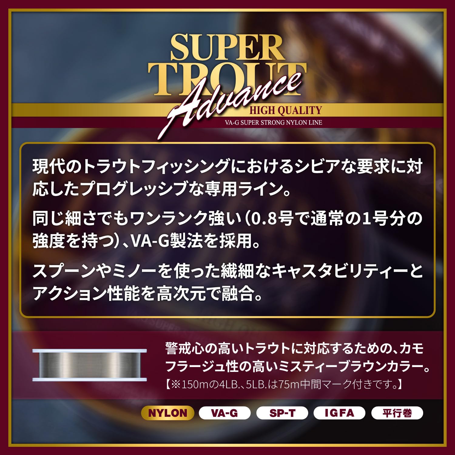 カモフラージュ性の高いミスティーブラウンカラーと高密度分子結合製法(VA-G製法)により同強度でワンランク細いラインはプレッシャーによって非常にナーバスになったトラウトたちの警戒心を和らげ繊細なスプーンのキャスタビリティーとミノーへのアクション性能を高次元で融合