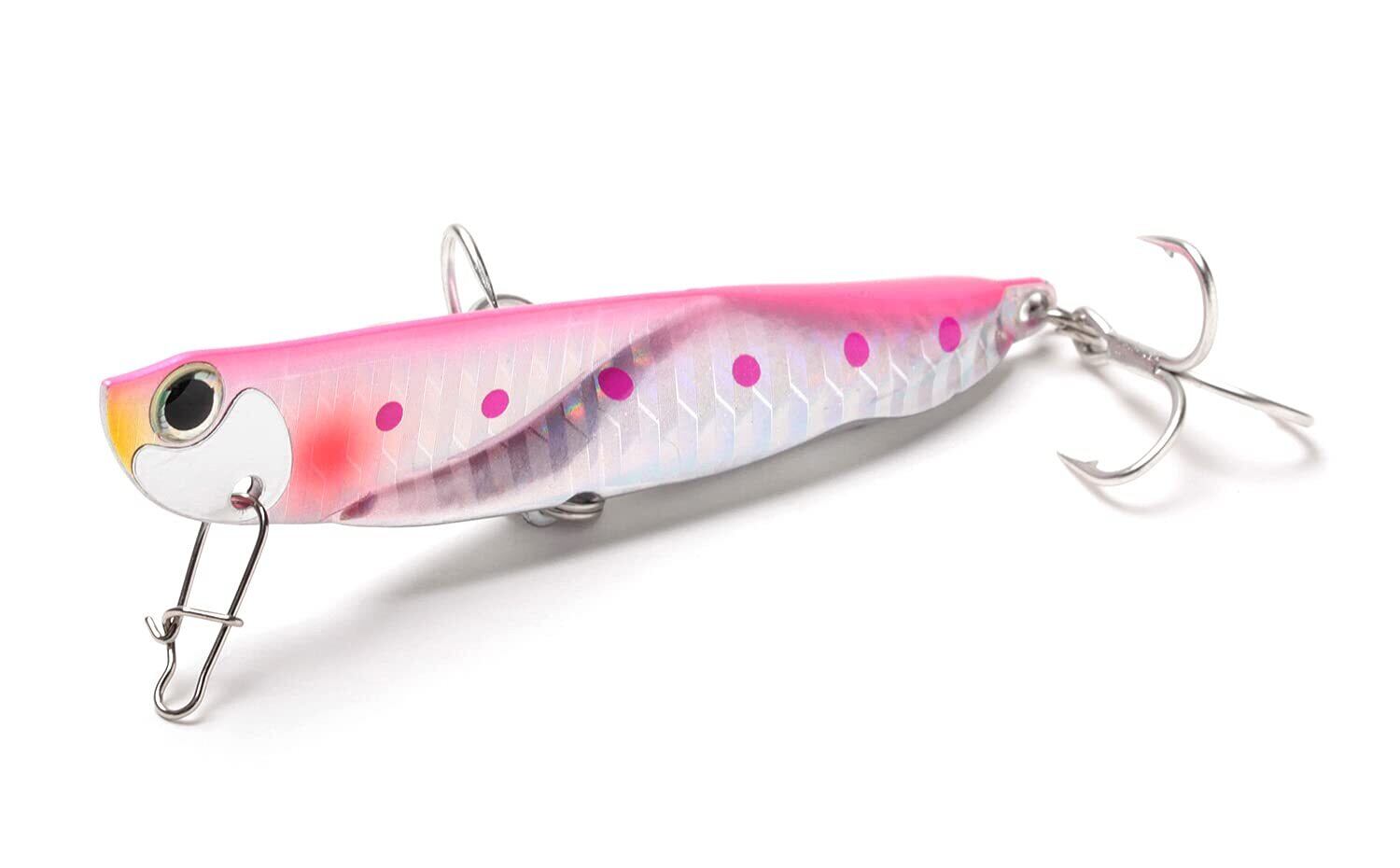 まさに飛び過ぎ! サーフや港湾、河川、磯など、あらゆるフィールドをカバーできるサイズ。対象魚もヒラメやシーバス、コチ、青物など、ほぼ全ての中型フィッシュイーターが狙えます。持ち前の飛距離をいかし、より広いエリアを攻略。自重の数値から想像される飛距離のイメージ以上に飛びますので、『距離は出したいけど浅い』『距離は出したいけどベイトが小さい』など、求めている飛距離とレンジやベイトサイズが合わないような歯がゆいシチュエーションでも攻略が可能です。アクションはかなり激しいワイドウォブリングアクションなので、水中での存在感は抜群。魚影が 薄いコンディションでも魚達にその存在が気づかれやすく、広い範囲の魚にアピールできます。フリーフォールでは素早くボトムを取ることができ、カーブフォールではローリングしながらのフォールで誘います。オールレンジ対応なので、後方からのバイトはもちろん、下からの突き上げるようなバイトや横から回り込んでのバイトなど、あらゆるバイトに対して高いフッキング率を得られるよう、テールのみではなく腹部にもトレブルフックを設置しています。