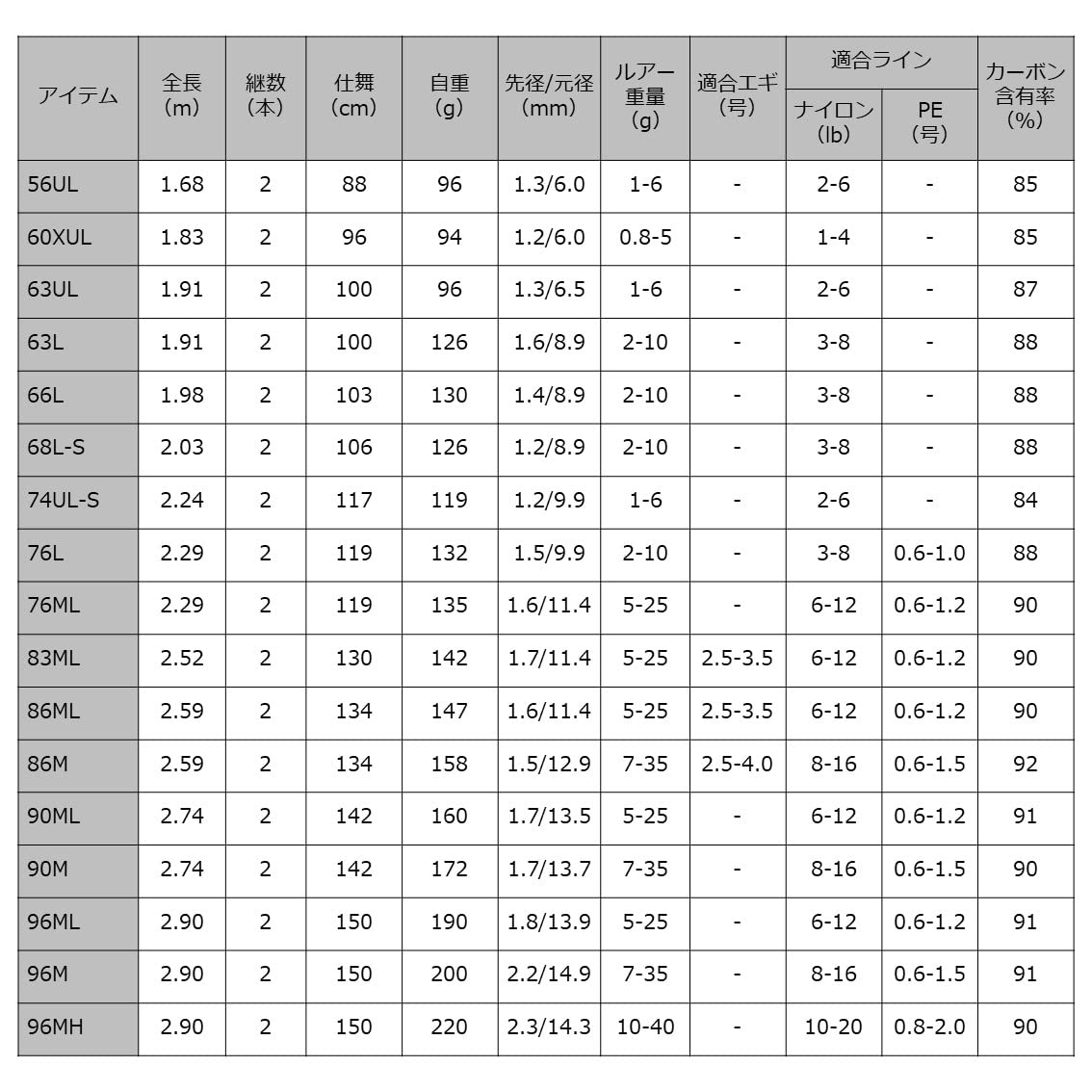 全長(m):2.24 / 継数(本):2 / 仕舞寸法(cm):117 / 標準自重(g):119