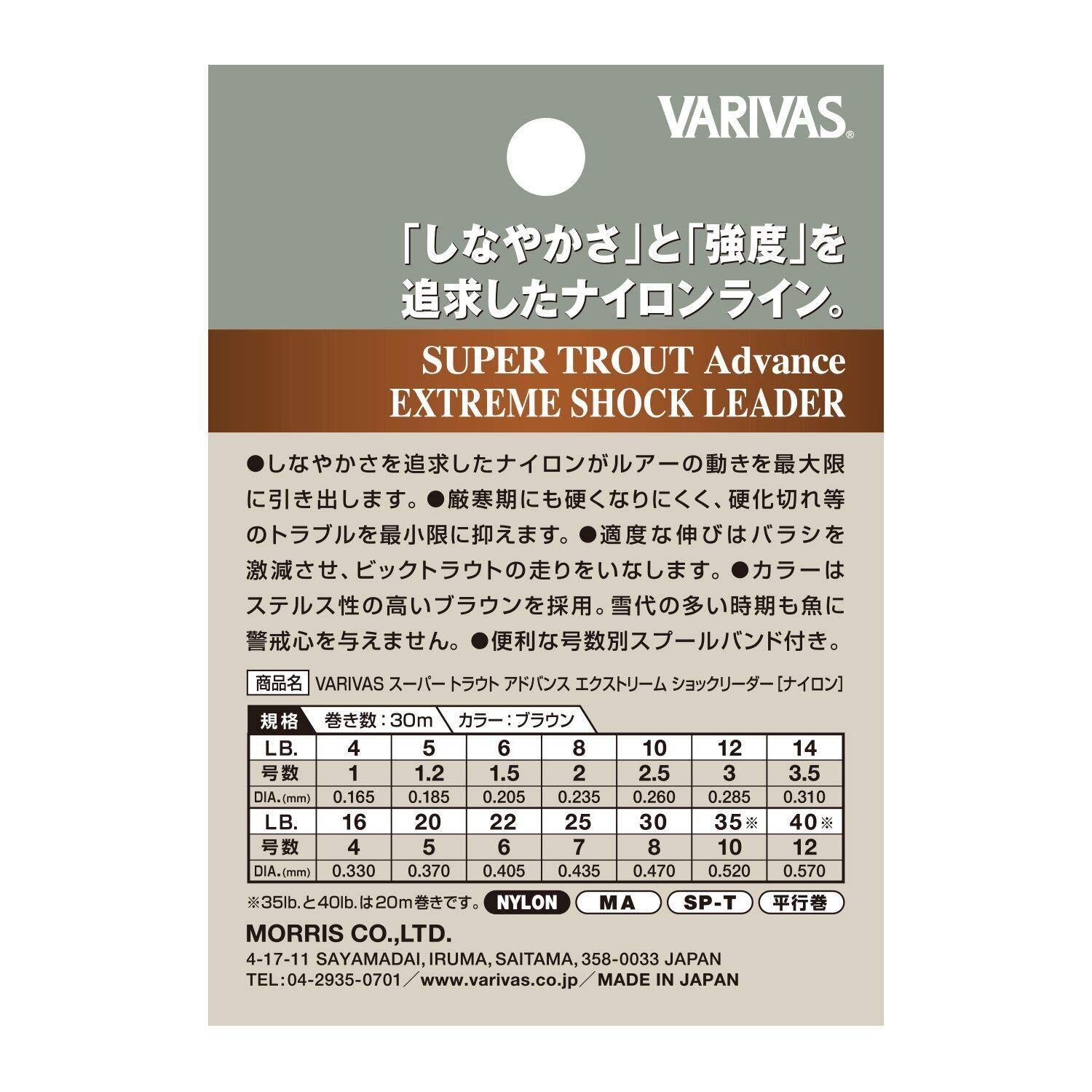 しなやかさが千載一遇をものにする。「しなやかさ」と「強度」を追求した、ネイティブトラウト専用ショックリーダー。●しなやかさを追求したナイロンがルアーの動きを最大限に引き出します。●厳寒期にも硬くなりにくく、硬化切れ等のトラブルを最小限に抑えます。●適度な伸びはバラシを激減させ、ビックトラウトの走りをいなします。●カラーはステルス性の高いブラウンを採用。雪代の多い時期も魚に警戒心を与えません。●便利な号数別スプールバンド付き。
