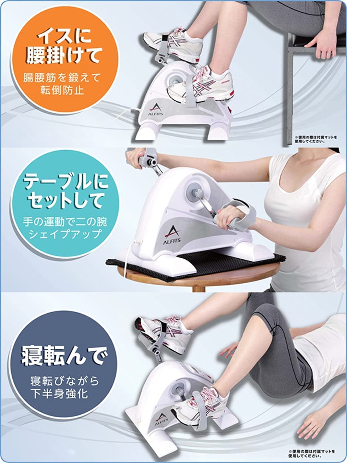 【多彩な使用方法】椅子に腰かけての運動以外にも「テーブルの上に置いて」ペダルを手で回せば二の腕のシェイプアップも可能です。さらに「横になった状態」でもバイク運動が出来ます。スマホや読書をしながら楽な姿勢で下半身の強化が出来ます。