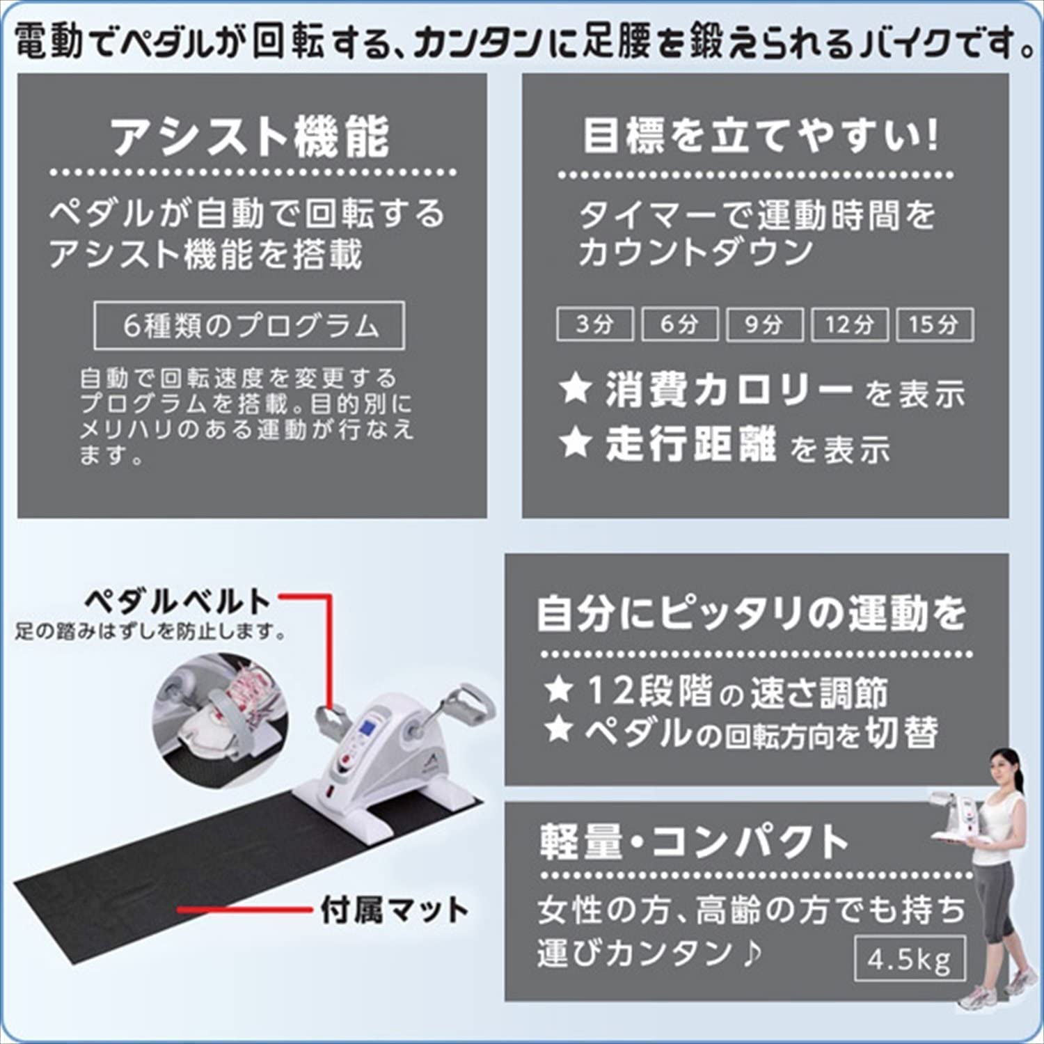 【アシスト機能付きコンパクトバイク】ペダル部分のみのシンプルな電動サイクルです。自宅の椅子を使って手軽にバイク運動が出来ます。ペダルが自動で回転するアシスト機能搭載で、運動に慣れていない方や高齢の方でもゆっくりとしたペースで運動が出来ます。運動に慣れた後は徐々にスピードを上げ、体力アップも図れます。省スペースで手軽に有酸素運動ができるので運動の苦手な人や上半身を引き締めたい女性の人にもオススメです。