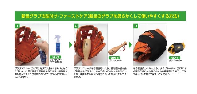 グラブに適度な油分を与え、なめらかに柔らかくします。