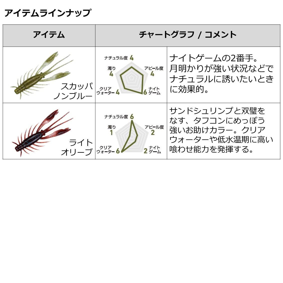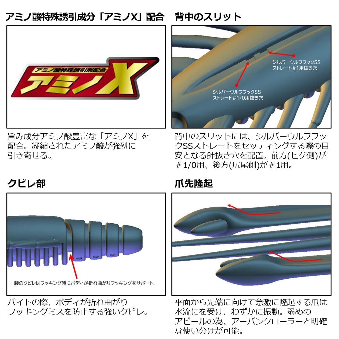当社独自のテクノロジー「アミノX」とエビ粉をボディ素材に配合 集魚成分もフッキングに持ち込む強いバイトを引き出すための重要な 役割を果たしている。