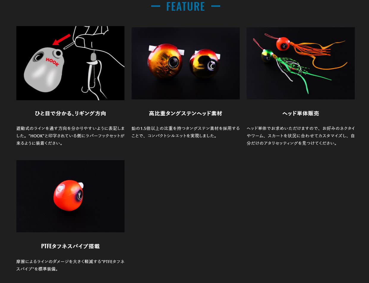 より高比重、よりコンパクト。高比重タングステン素材によるコンパクトなシルエットと、あえてシンプルに設計した形状により、安定した「静の動き」で鯛を誘います。また、NEOシリーズの45g~120gは、旧モデルより比重を上げることによって、さらにコンパクトなシルエットとなっています。高比重/高硬度のタングステンがもたらす感度の良さは、着底の瞬間や底質の変化等のあらゆる情報をユーザーまで届けます。さらに、軽い巻き抵抗により、小さなバイトや僅かな変化も感じ取ることができます。