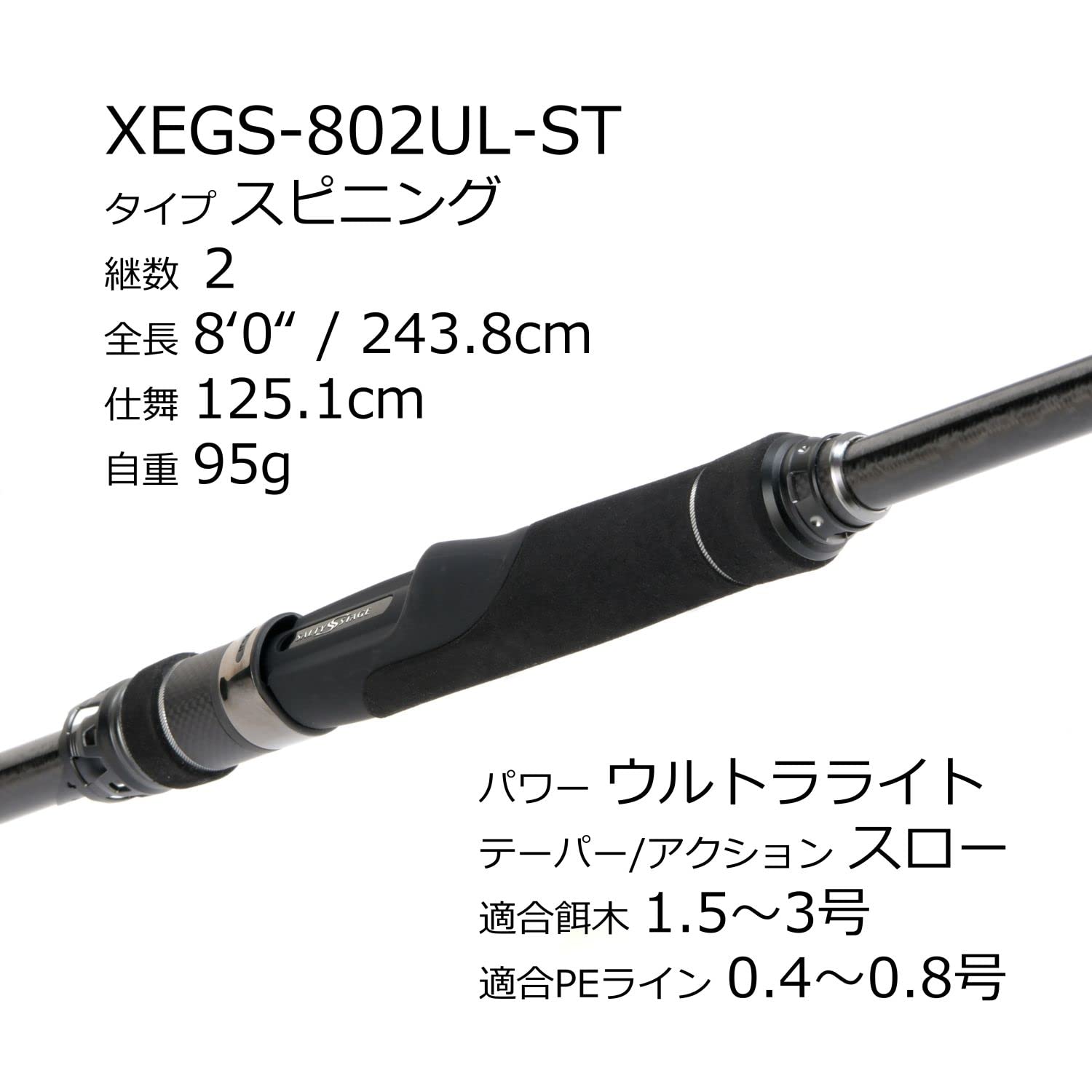 全長:8'0フィート (約243.8cm) / 継数:2本 / 自重:95g / パワー:UL / テーパー:スロー