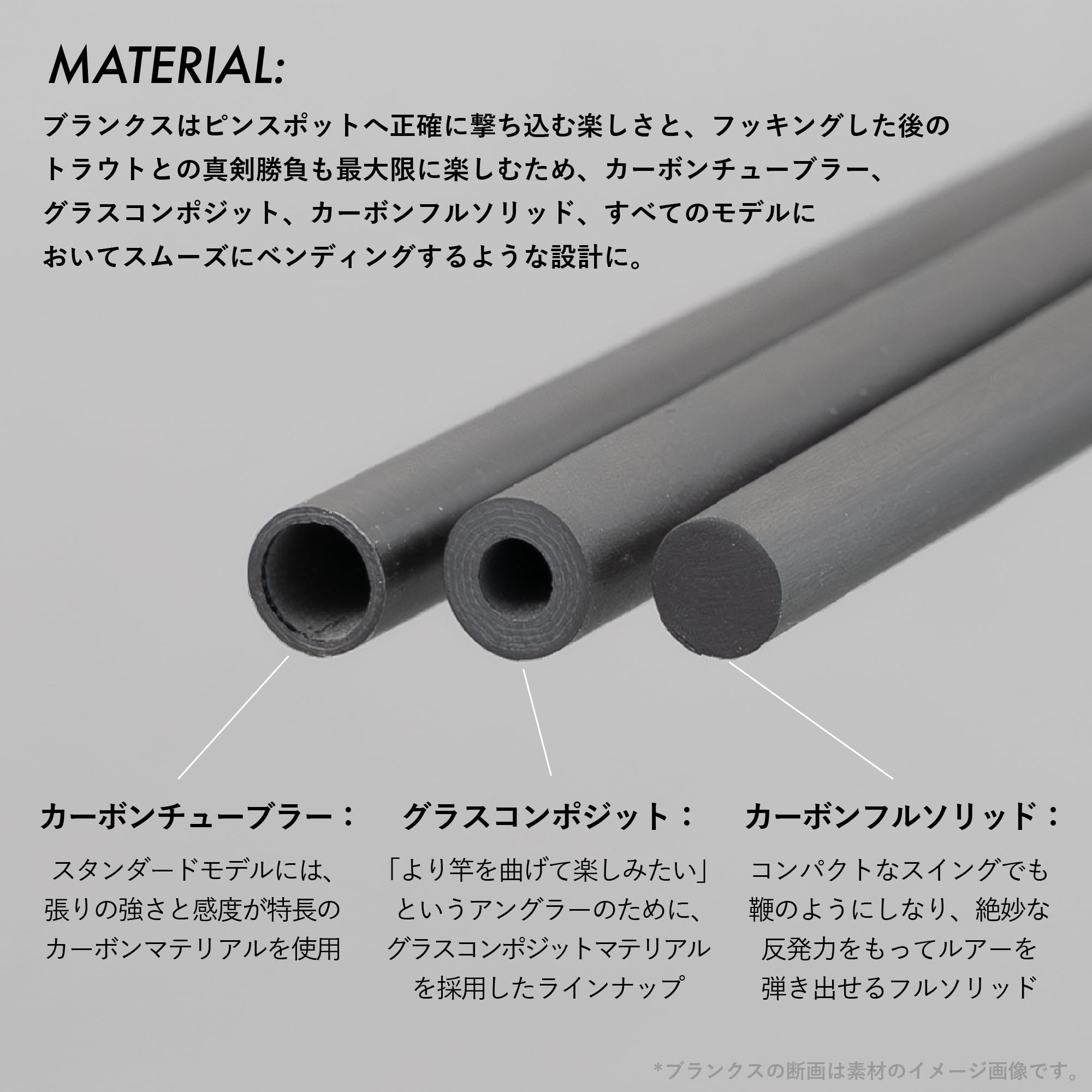 ブランクスはピンスポットへ正確に撃ち込む楽しさと、フッキングした後のトラウトとの真剣勝負も楽しむため、すべてのモデルにおいてスムーズにベンディングするような設計に。