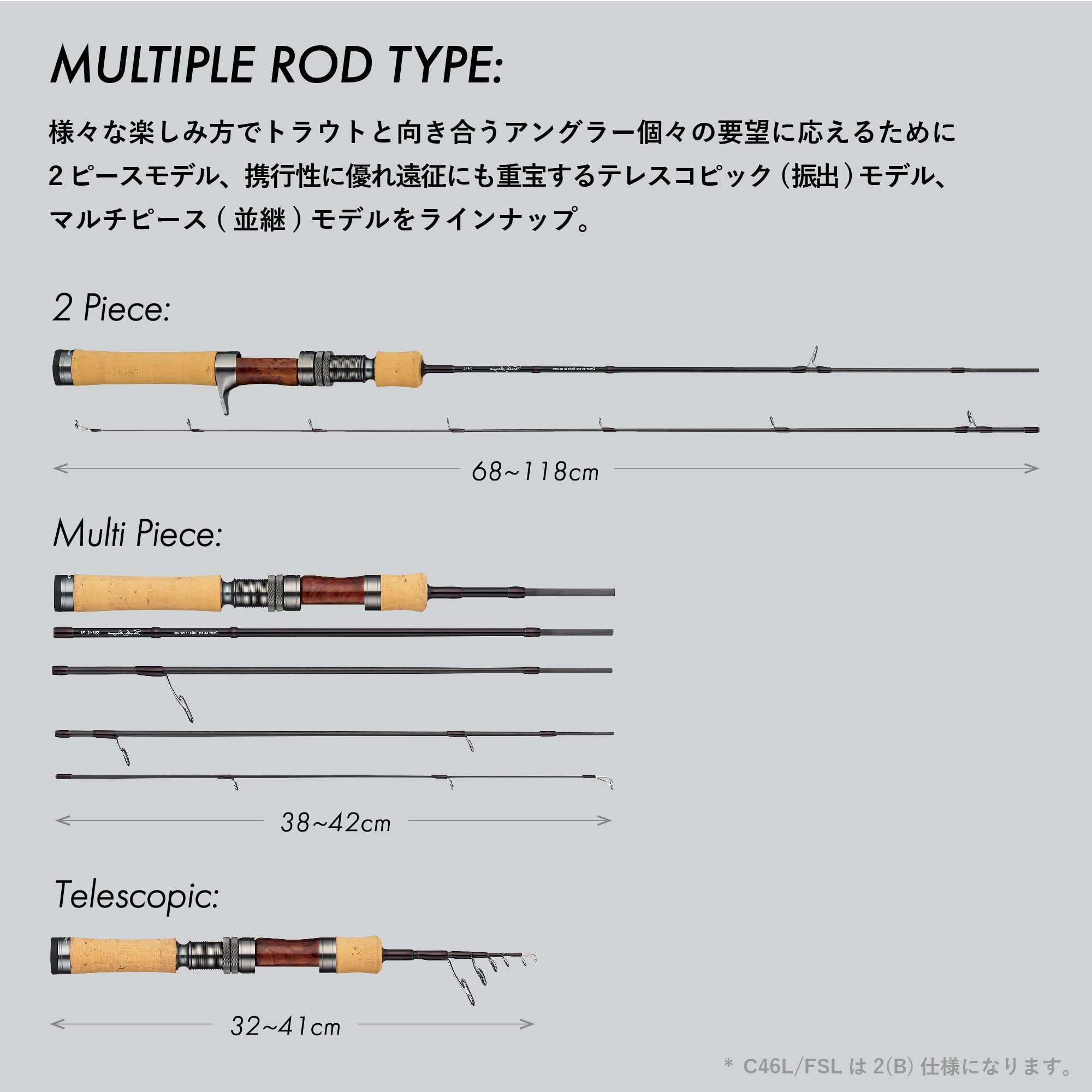 自然美と融和するようなロッドシリーズが新たに誕生した。様々な楽しみ方でトラウトと向き合うアングラー個々の要望に応えるため、「スタンダードなセンターカット2ピースモデル」の他、「携行性に優れ遠征にも重宝するテレスコピック(振出)モデル」「マルチピース(並継)モデル」と、様々なロッドタイプをラインナップ
