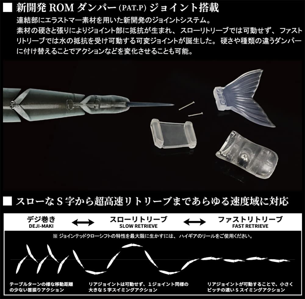 『ジョインテッドクローシフト183』は、スローなS字スイミングはもちろん、低速から超高速まで全速度域をカバーすることができる新しいジョインテッドクローです。リアジョイントには新開発の【ROMダンパー(PAT.P)】を搭載。リトリーブスピードやリーリングピッチを変化させることで多彩なスイムアクションを演出することができるS字系ビッグベイトです。
