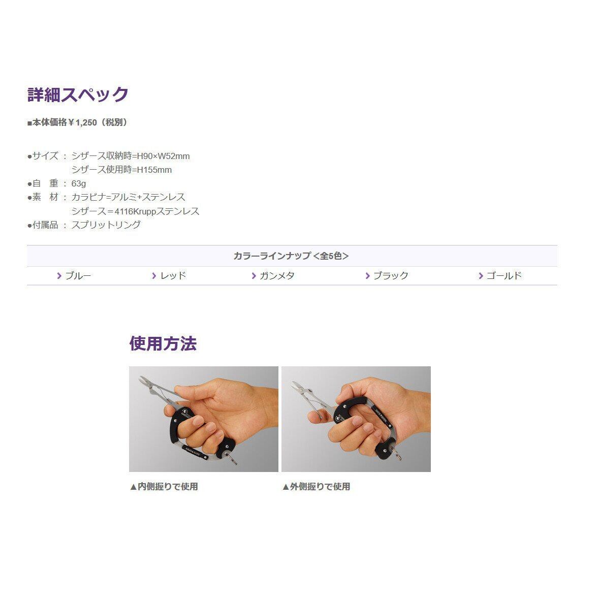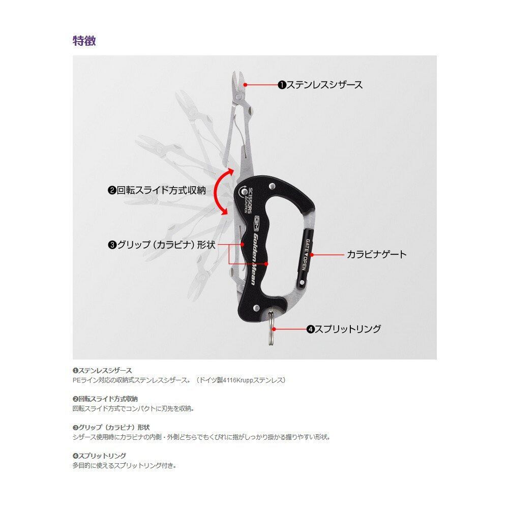 GoldenMean/ゴールデンミーンGM KARABINER SCISSORS/GMカラビナシザース◆サイズ:シザース収納時=H90×W52mm/シザース使用時=H155mm◆自量:63g◆素材:カラビナ=アルミ+ステンレス シザース=4116Kruppステンレス◆付属品:スプリットリング切れ味抜群のステンレス製シザースを携帯に便利なカラビナにコンパクト収納。GMカラビナシザースは、コンパクトなサイズと使いやすさを兼ね備えたカラビナ型収納式シザースです。PEライン対応のシザースには、ドイツ製4116Kruppステンレスを採用。使わない時は刃先をカラビナの中に収納できるので、バッグやウェアのループな様々な場所に簡単に取り付けて安全・コンパクトに携帯できます。※PEラインを切る場合、ラインを少し張り気味にすると切りやすくなります。