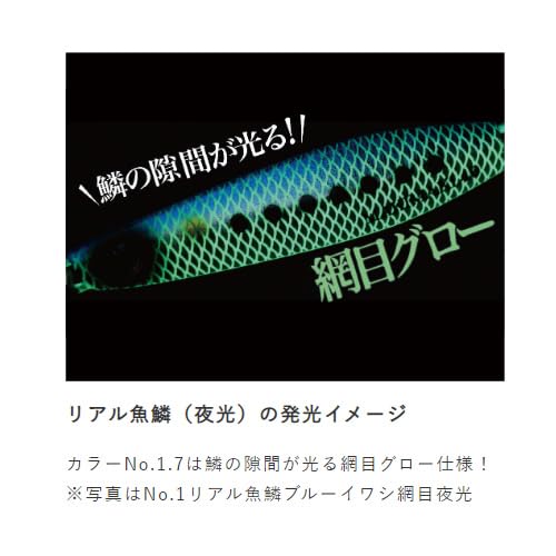リアル魚鱗(夜光)の発光イメージ:カラーNo.1.7は鱗の隙間が光る網目グロー仕様! ※写真はNo.1リアル魚鱗ブルーイワシ網目夜光