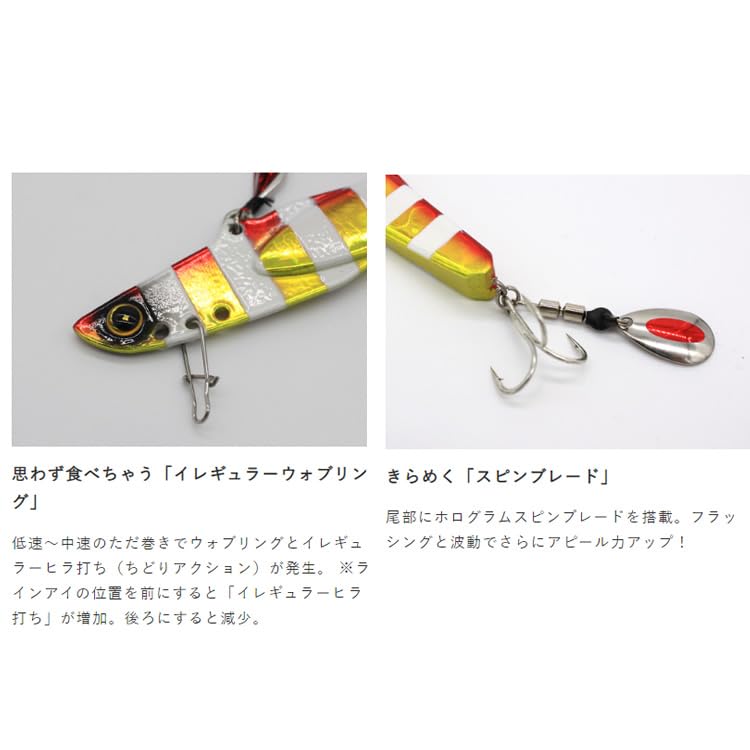 思わず食べちゃう「イレギュラーウォブリング」:低速~中速のただ巻きでウォブリングとイレギュラーヒラ打ち(ちどりアクション)が発生。 ※ラインアイの位置を前にすると「イレギュラーヒラ打ち」が増加。後ろにすると減少。