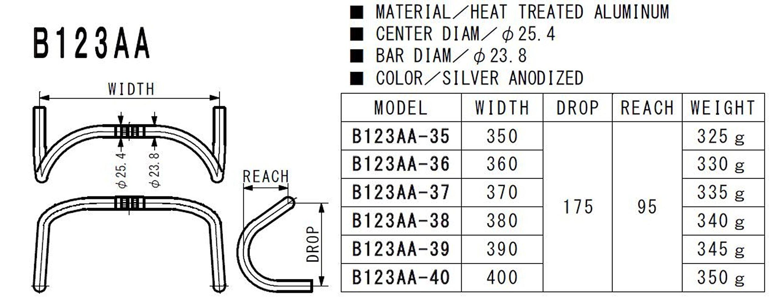 NITTO(日東) ドロップハンドル B123AA B123AA-37 φ25.4 370 シルバー