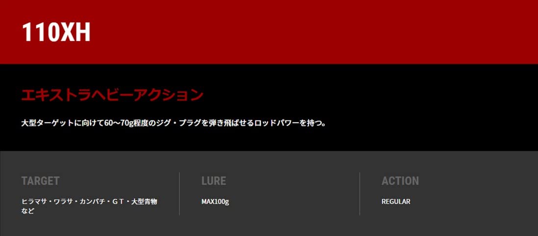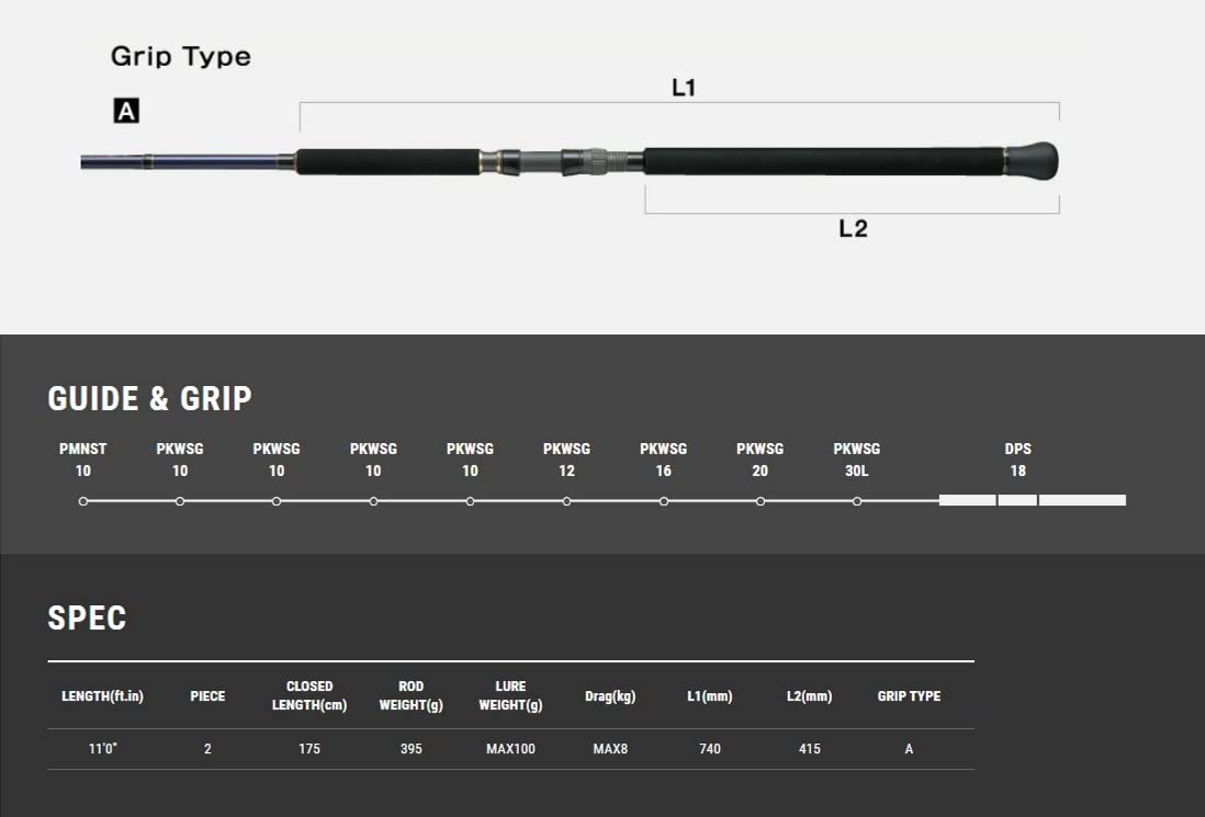 ●全長:11ft●継数:2本●仕舞寸法:175cm●標準自重:-g●ドラグマックス:8kg●ルアーウェイト:MAX100g