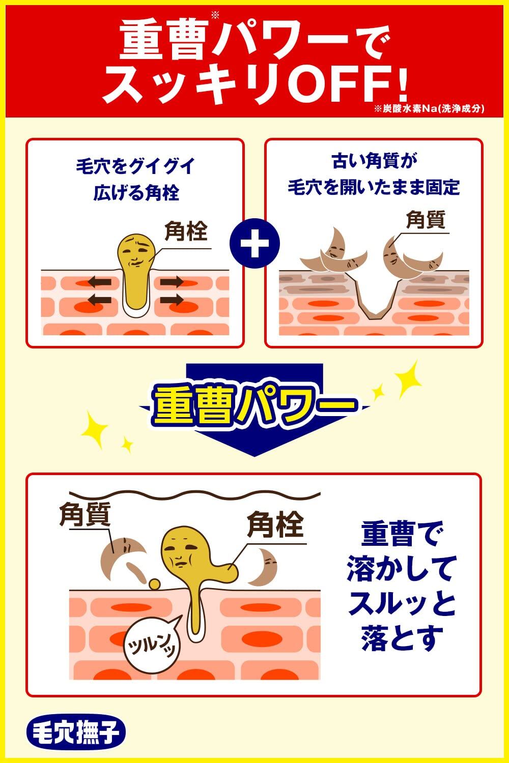 毛穴のためのしっとり洗顔料。パウダータイプ。 重曹(炭酸水素Na / スクラブ)は水に溶けやすいので、水分が加わるとすぐ結晶の角が取れ、肌の表面を傷つけずに角質や汚れを取り除きます。 余分な汚れのみを落としてくれる肌に負担をかけにくいアミノ酸系洗浄料を配合。だから、洗いあがりはし~っとりツルツル。 皮脂と角質からなる角栓が原因のブツブツイチゴ毛穴。重曹が皮脂をジュワジュワ溶かし角栓をスッキリとります。 乾燥によりたまった角質が原因の開きオレンジ毛穴。重曹スクラブが、カチカチ角質にうるおいを与えながらゴロゴロ絡め取ります。