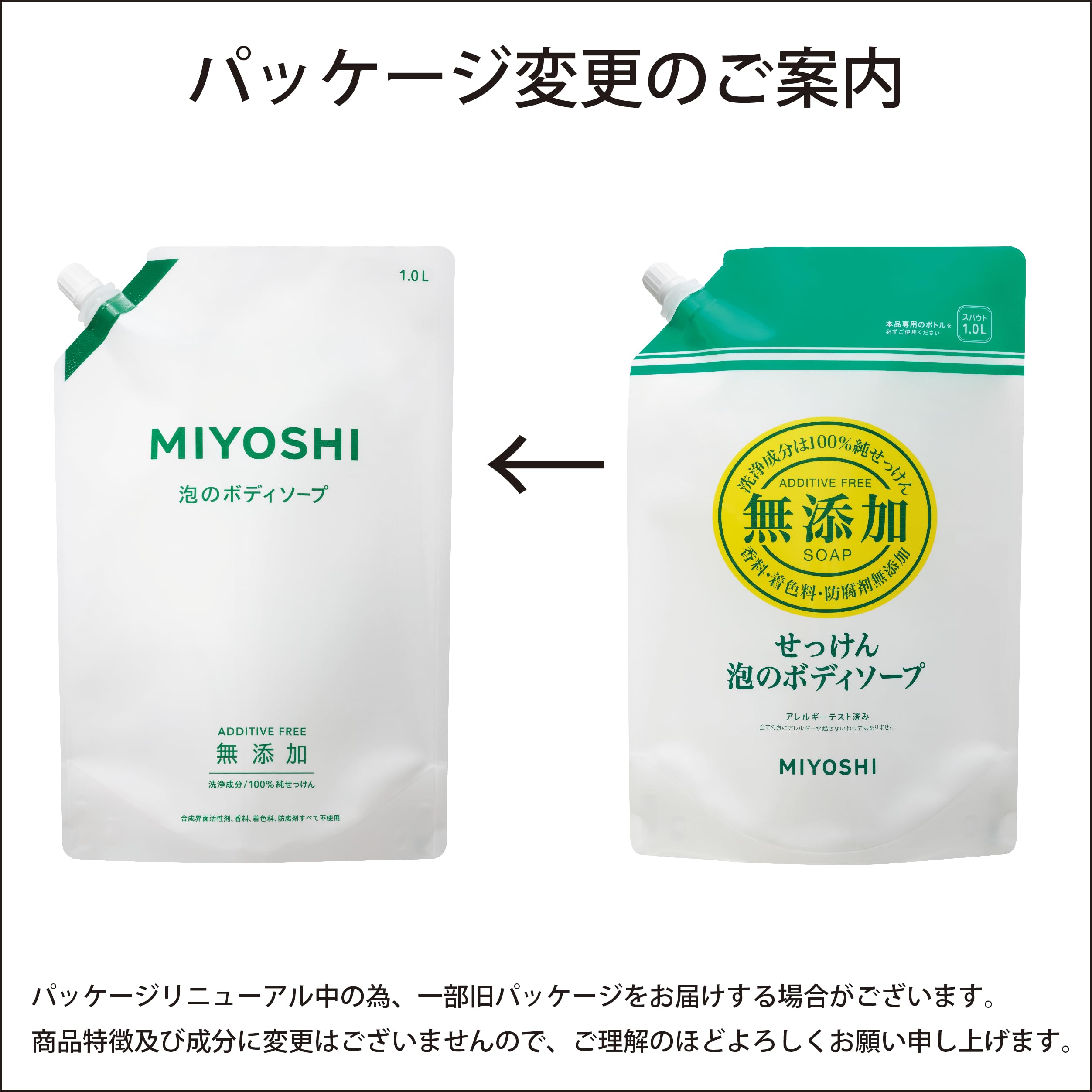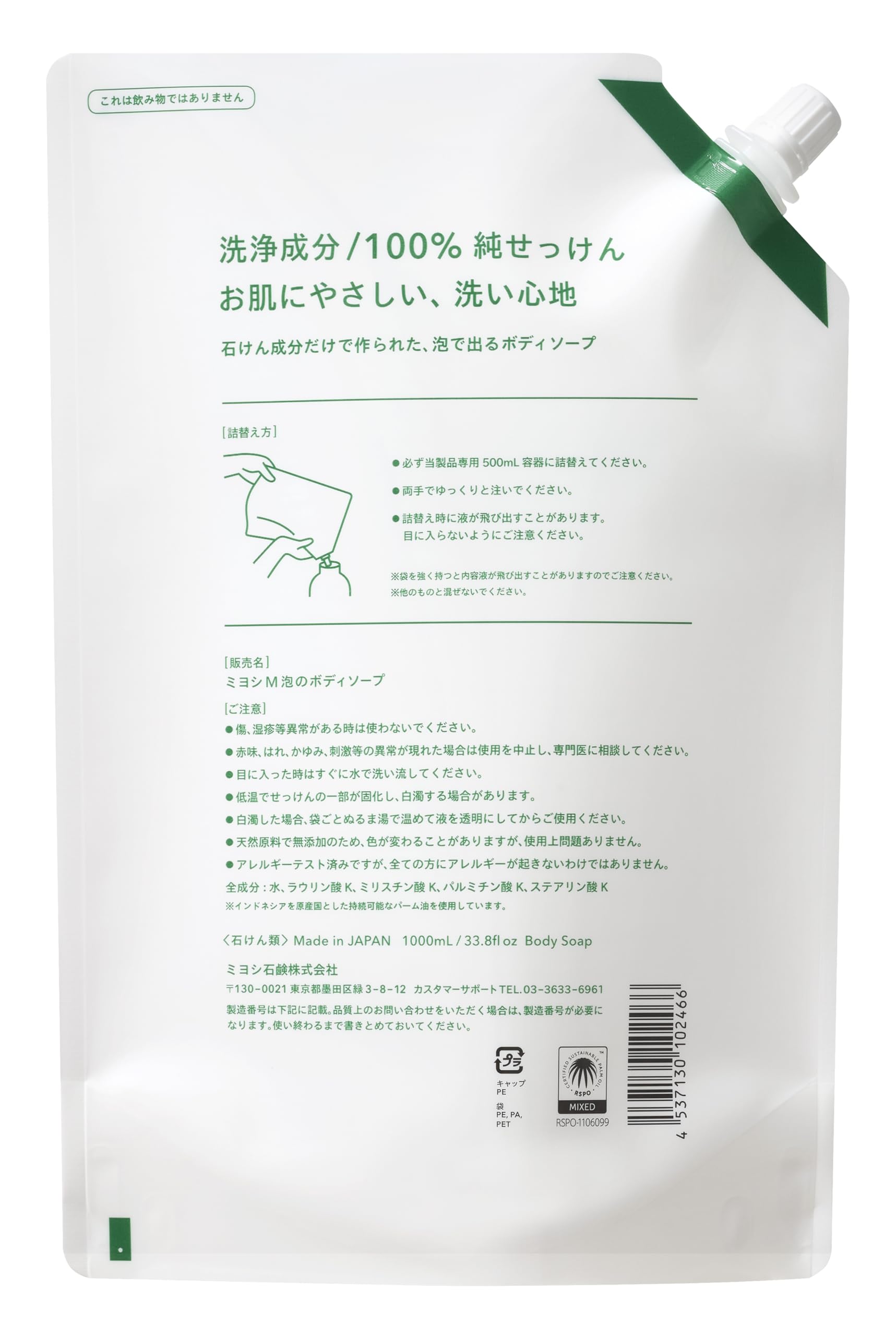 ・お肌に傷、湿疹等異常があるときは使わないでください。又、お肌に合わない時(赤味、はれ、かゆみ、刺激等)はご使用を中止してください。 ・刺激等の異常が現れたときは使用を中止し、専門医等に相談してください。 ・目に入らないように注意し、入ったときはすぐに水でよく洗い流してください。 ・低温で石けんの一部が固化したり、白濁することがあります。その場合は袋ごとぬるま湯で温めて液を透明にしてからご使用ください。 ・天然原料で無添加のため色が変わることがありますが、使用上問題ありません。 ・必ずミヨシ石鹸社製品専用500mL容器に詰替えてください。