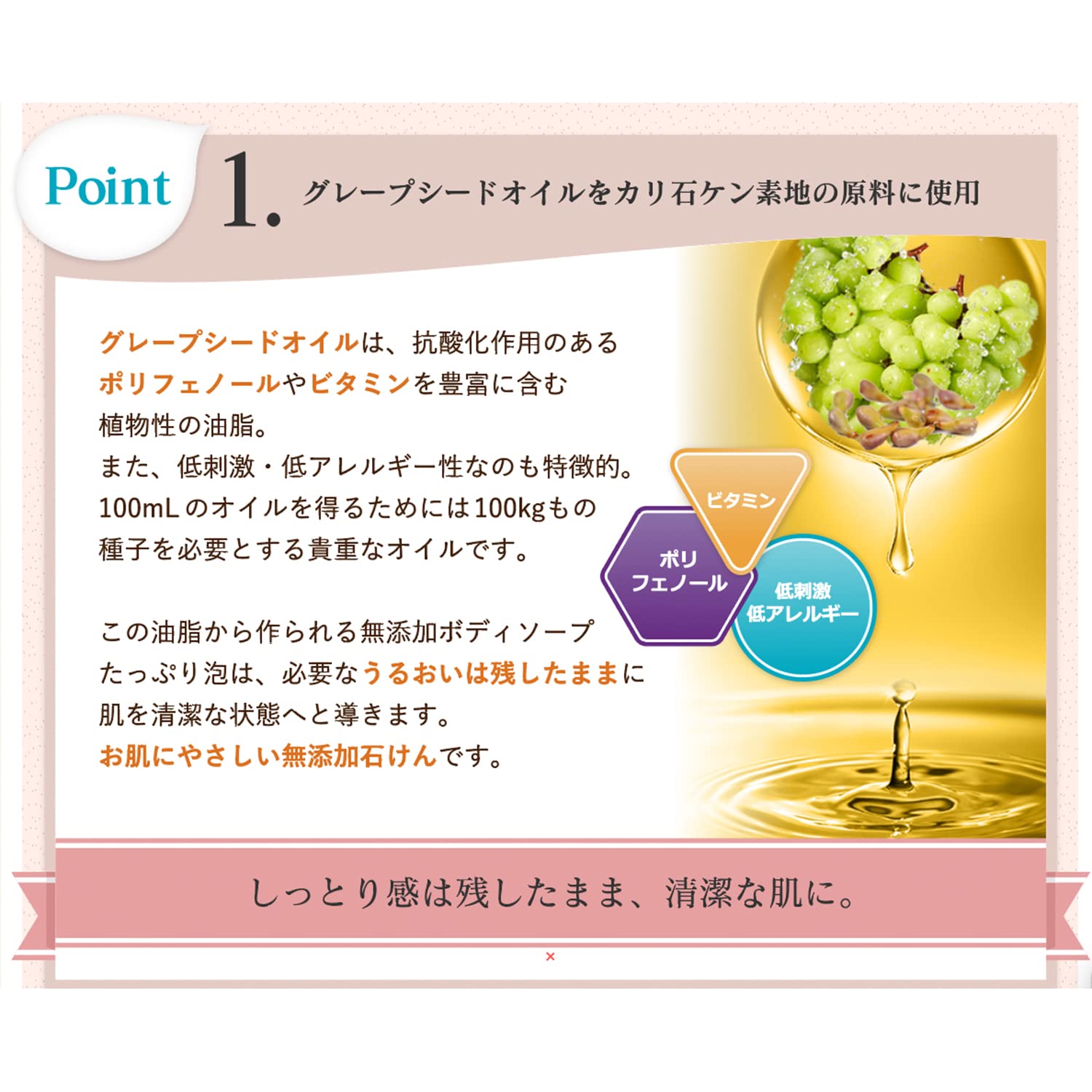 グレープシードオイルをカリ石ケン素地の原料に使用した、香料・着色料・酸化防止剤・合成界面活性剤を使用していない無添加石けんです。きめ細かい泡が作れ、サッパリしながら潤う洗いあがりになります。