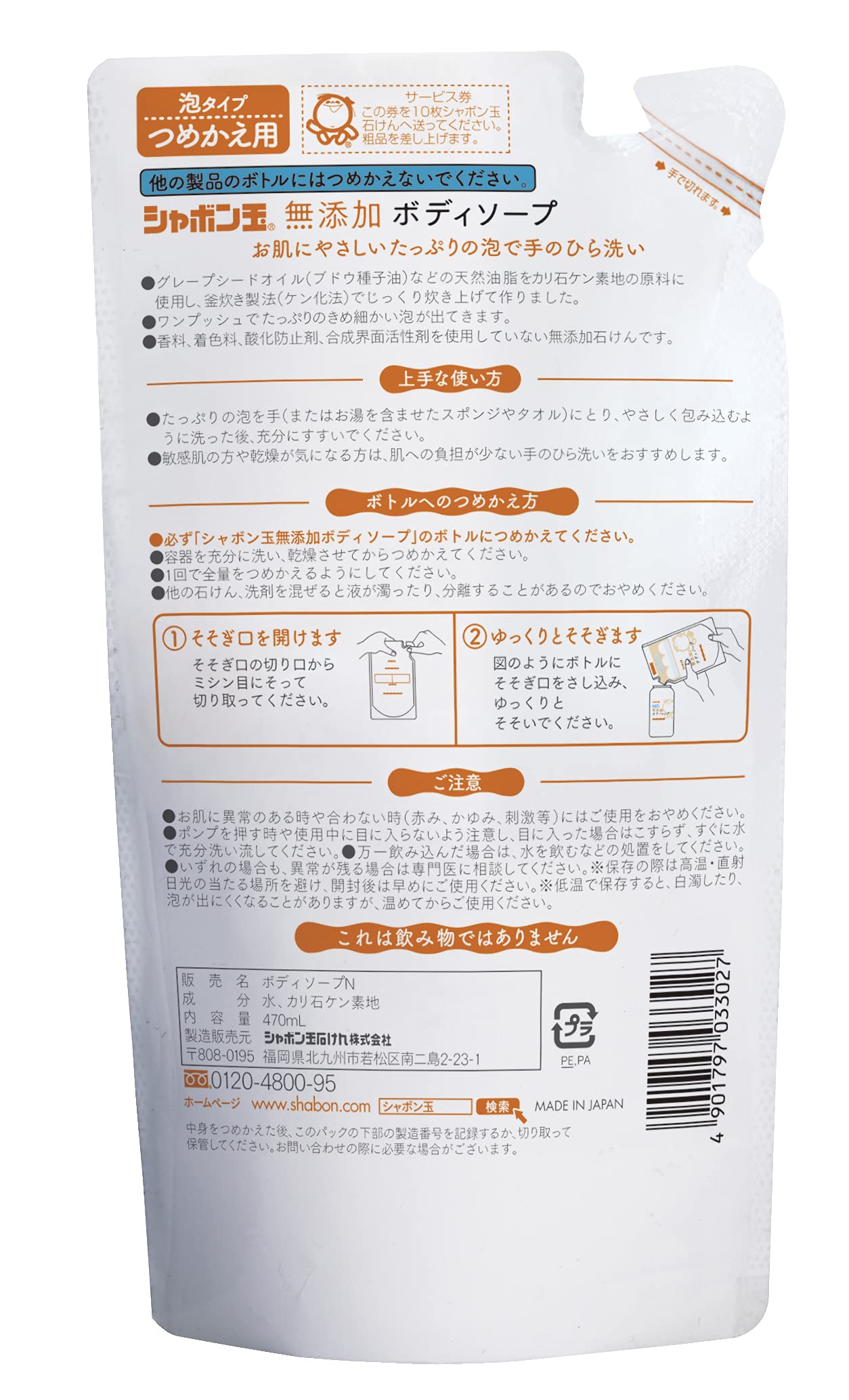 シャボン玉 無添加ボディソープたっぷり泡 つめかえ用 470mL 手のひら洗いしやすい