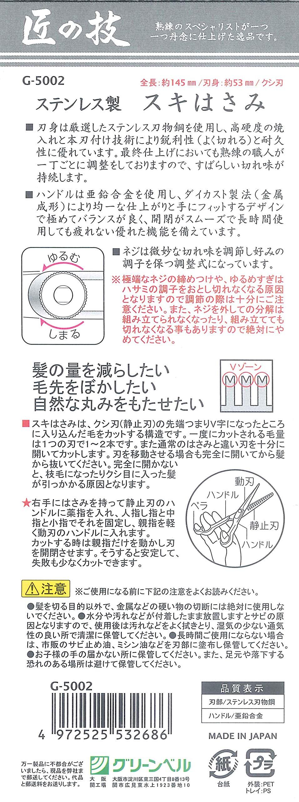 グリーンベル 匠の技 ステンレス製 スキはさみ G-5002 単品 グリーン 1個 (x 1)