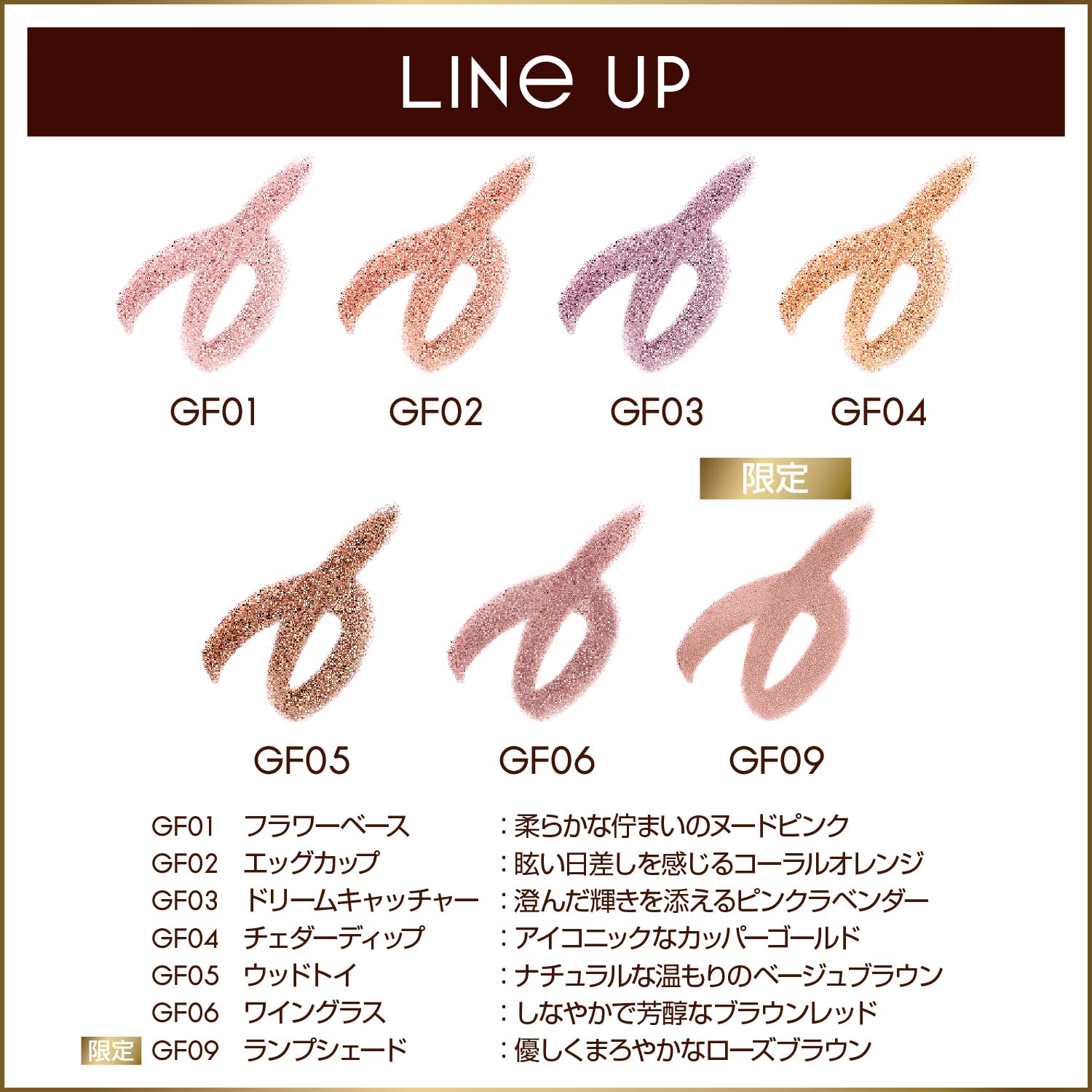 なめらかな質感と繊細な煌めき。高密着なスティックアイシャドウ。・丸い芯先で、まぶたに広く塗りやすい。細いスティック形状だから、ポーチの中でかさばらないデザインに。 1.18時間仕上がり持続テスト済み*¹。抜群の密着力で、夜までヨレずに美しさが続く! こすれに強いスマッジプルーフ汗・皮脂・水に強いウォータープルーフ。 2.クリーミーななめらか質感。ムラなくするする描けて目元にフィット。 3.目元の乾燥を防ぐセラミド*²・スクワラン(すべて保湿)配合。 *1 当社調べ。仕上がりには個人差があります。 *2 セラミドNP ■GF09(ランプシェード):優しくまろやかなローズブラウン