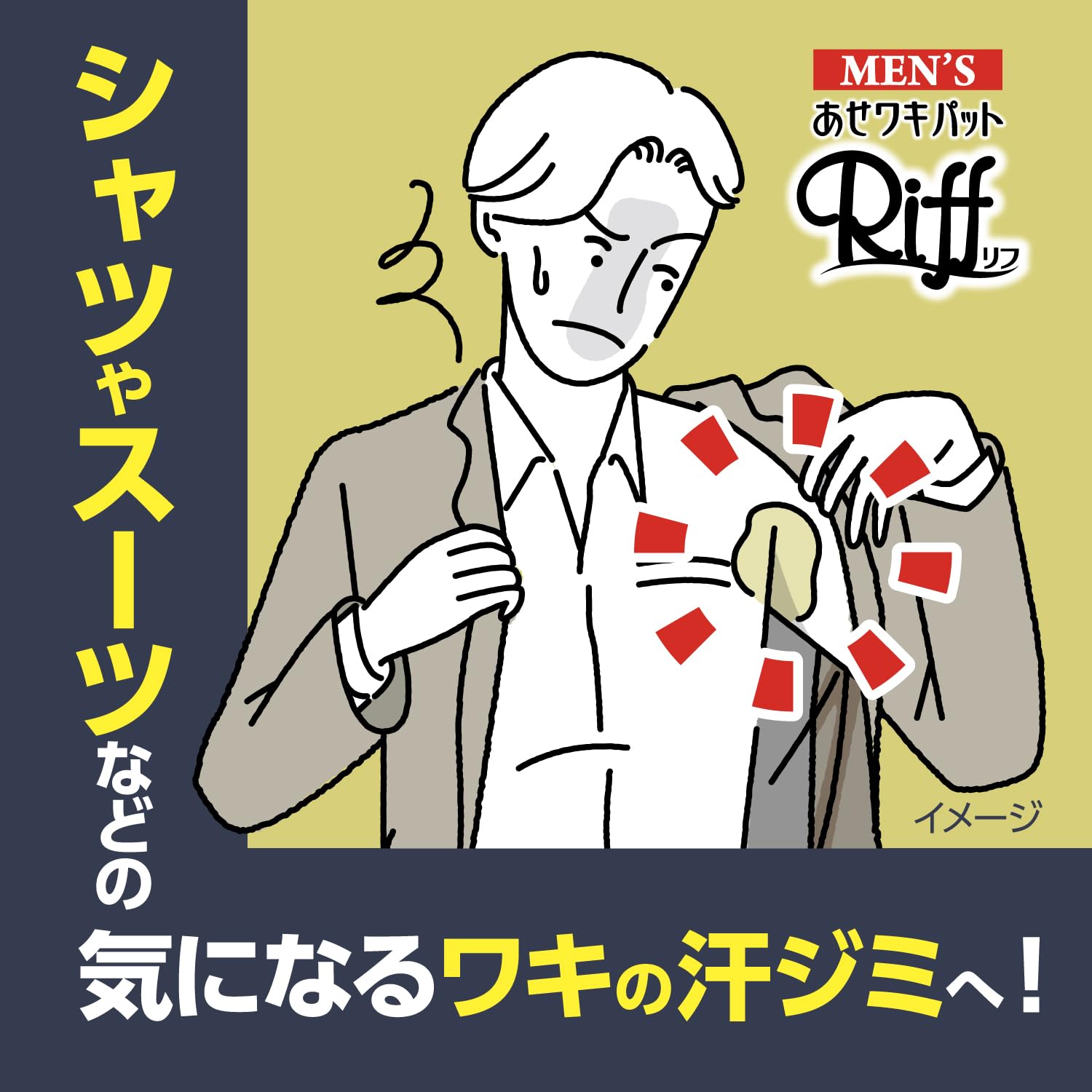 ●衣類に貼って、汗ジミと黄ばみを防ぐ汗吸収シート●男性の汗をたっぷり吸い込む3層構造シート●表面の汗を残しにくい吸収シート採用で、汗をすばやく引き込んでさらさら感が続く●衣類に貼りやすく動きにフィットするスリット加工で、ヨレ・ズレしにくい●イオン抗菌で汗のニオイを防ぐ●デオドラントシトラスの香り