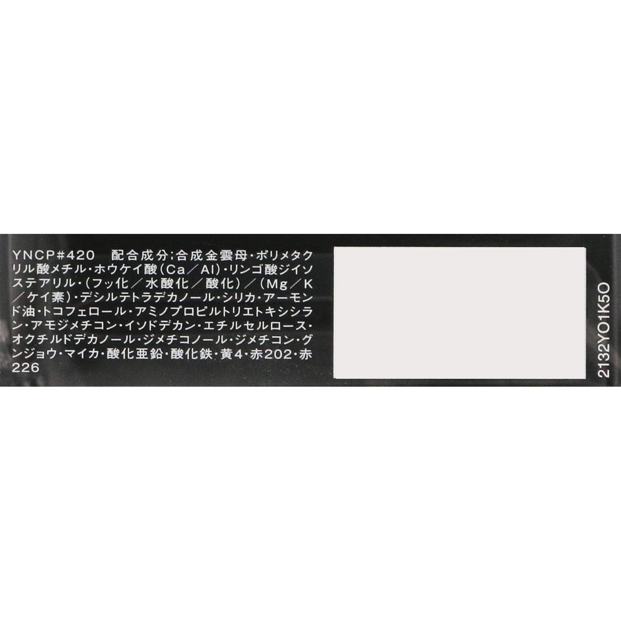 合成金雲母、ポリメタクリル酸メチル、ホウケイ酸 (Ca/Al) 、リンゴ酸ジイソステアリル、 (フッ化/水酸化/酸化) / (Mg/K/ケイ素) 、デシルテトラデカノール、シリカ、アーモンド油、トコフェロール、アミノプロピルトリエトキシシラン、アモジメチコン、イソドデカン、エチルセルロース、オクチルドデカノール、ジメチコノール、ジメチコン、グンジョウ、マイカ、酸化亜鉛、酸化鉄、黄4、赤202、赤226
