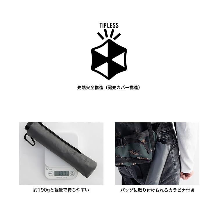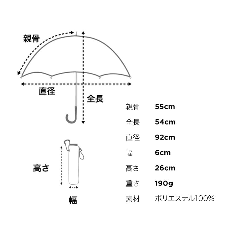 ライト&スリムの名前の通り重さが約190g、収納時の大きさも縦26cmの折りたたみ傘です。
