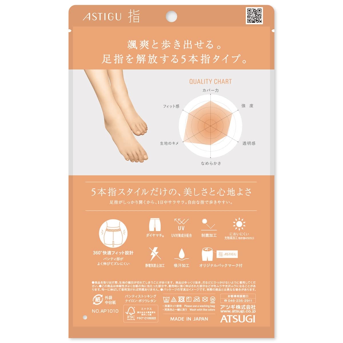 〇颯爽と歩き出せる。足指を解放する5本指タイプのストッキング。 〇低温合着ポリウレタン使用で伝線しにくさが向上。 〇ウエストテープの快適性と着用感が向上。 〇紙素材パッケージ採用で開封時のストレス無し。またプラスチック削減により環境負荷も低減。 〇伝線しにくさの向上。 〇寸法の見直しで着用感の向上。 〇業界に先駆けた、紙製の「ワンハンドパッケージ」を実現し、ASTIGUにおけるプラスチック使用量を大幅削減。 〇片手で開けてそのまま生地を取り出せるため、開封時のストレス無し。