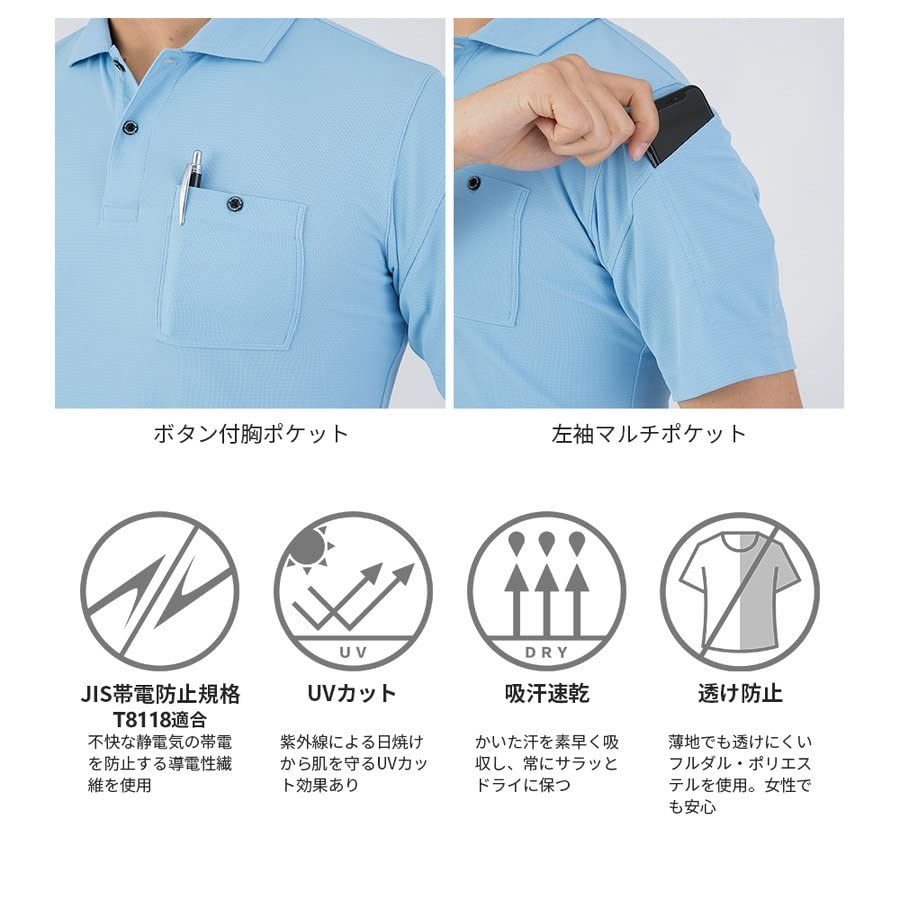 【特徴】●汗ジミ防止(汗取りパッド付き)●Xラインシルエット●左袖マルチポケット●脇消臭テープ●ボタン付き胸ポケット●JIS帯電防止規格合格●消臭効果●吸汗速乾●樹脂穴ボタン●透け防止●UVカット