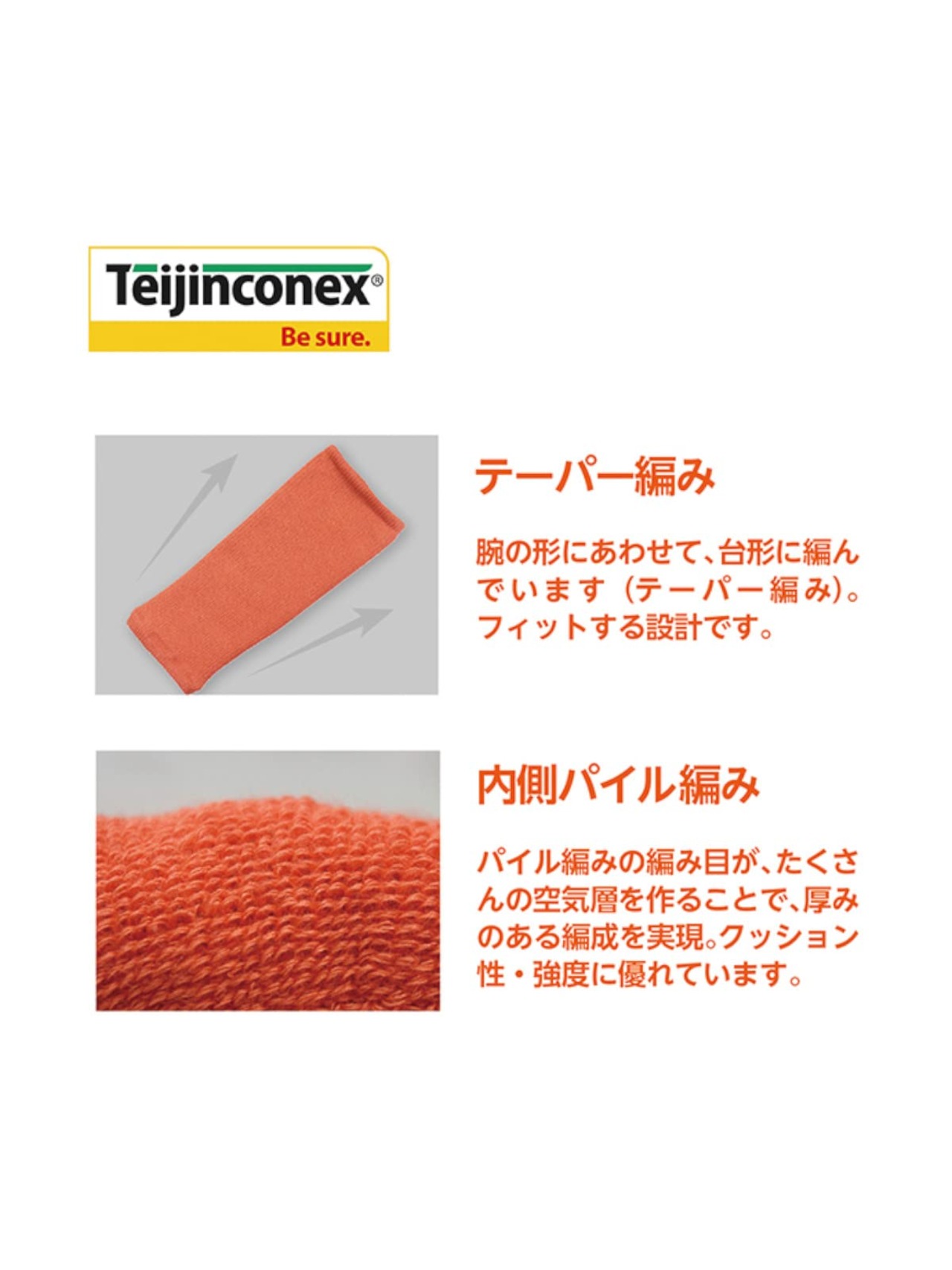 ●耐熱防炎難燃繊維を使用していますので、炎や熱にも着火せず、燃え上がらず、溶融して肌に付着することもありません。●内側がパイル編みになっていますので厚みのある組成を実現し、クッション性・強度に優れています。●手首を折り返して二重にしているので、優しいはめ心地です。●腕の形に合わせて台形に編んでいますので、腕にフィットします。●オーブンや窯での作業などに最適です。