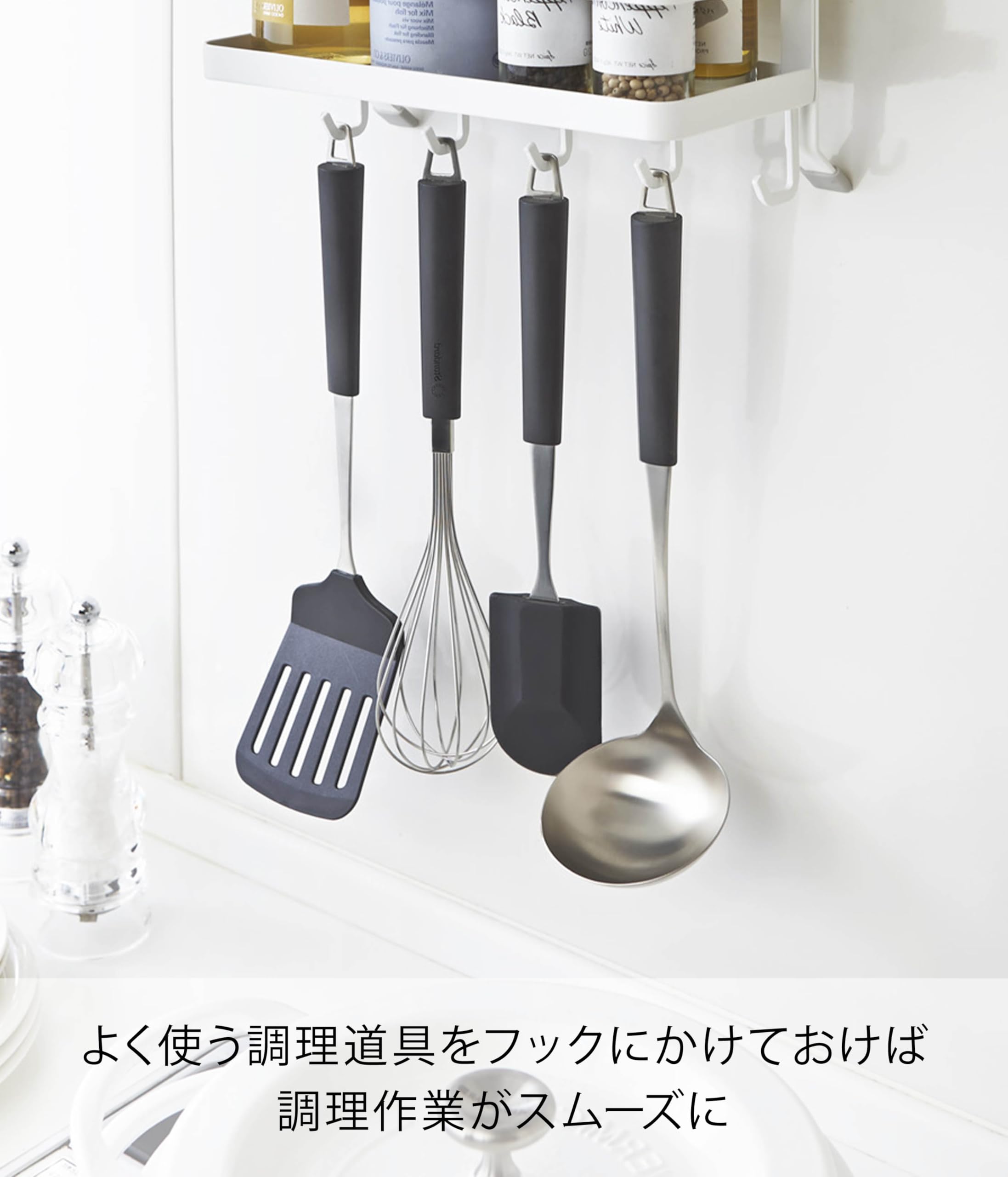 下にフックには、お玉やフライ返しなどの調理道具を収納。
