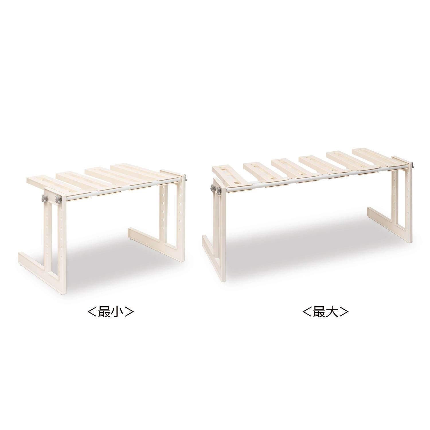 シンク下のサイズに合わせて幅50~75cmの間で伸縮することができ、棚の高さも3cm間隔でスペースに合わせて調節できます。