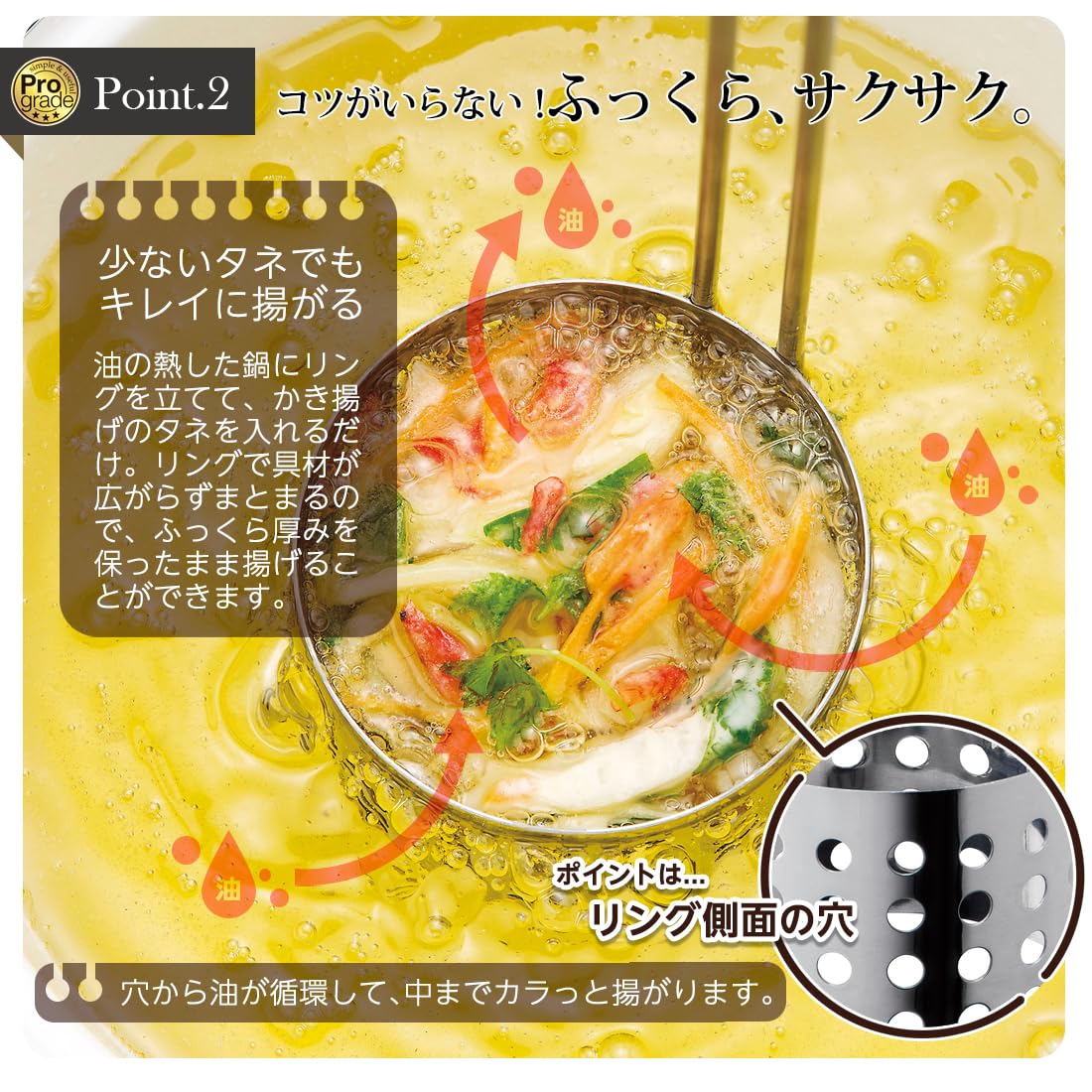 誰でも簡単にサクサクふんわりなかき揚げができます。 リングで具材が広がらずまとまるので品のある丸いかき揚げが簡単に作れます。 丸くて厚いおそば屋さんのようなかき揚げができます。