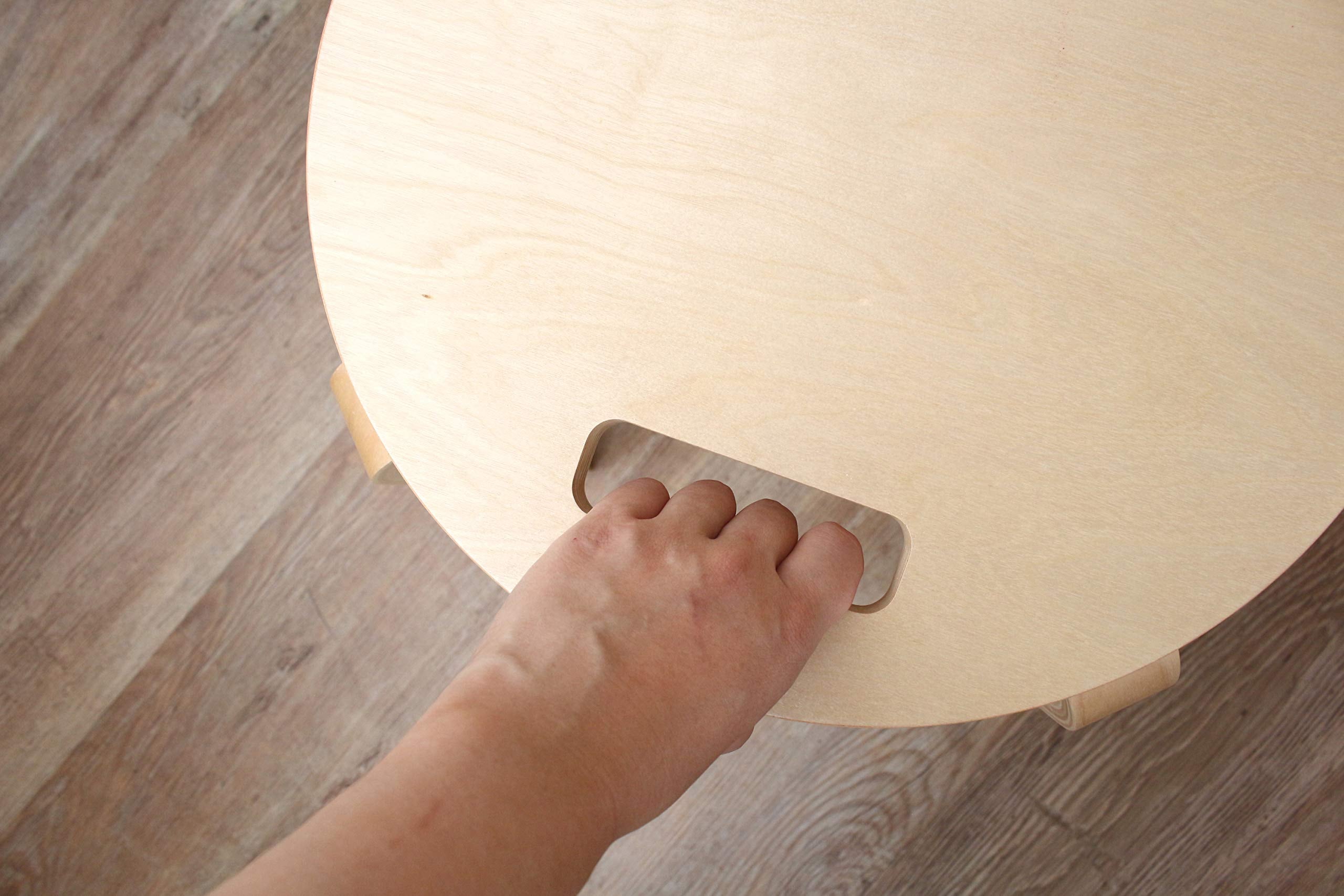 持ち運びラクラク天板にくり抜かれた持ち手は、シンプルなスツールの邪魔をしません。お客さんが来たときも、高いところのものを取るステップに使用するときもすっと持ち運べ便利です。