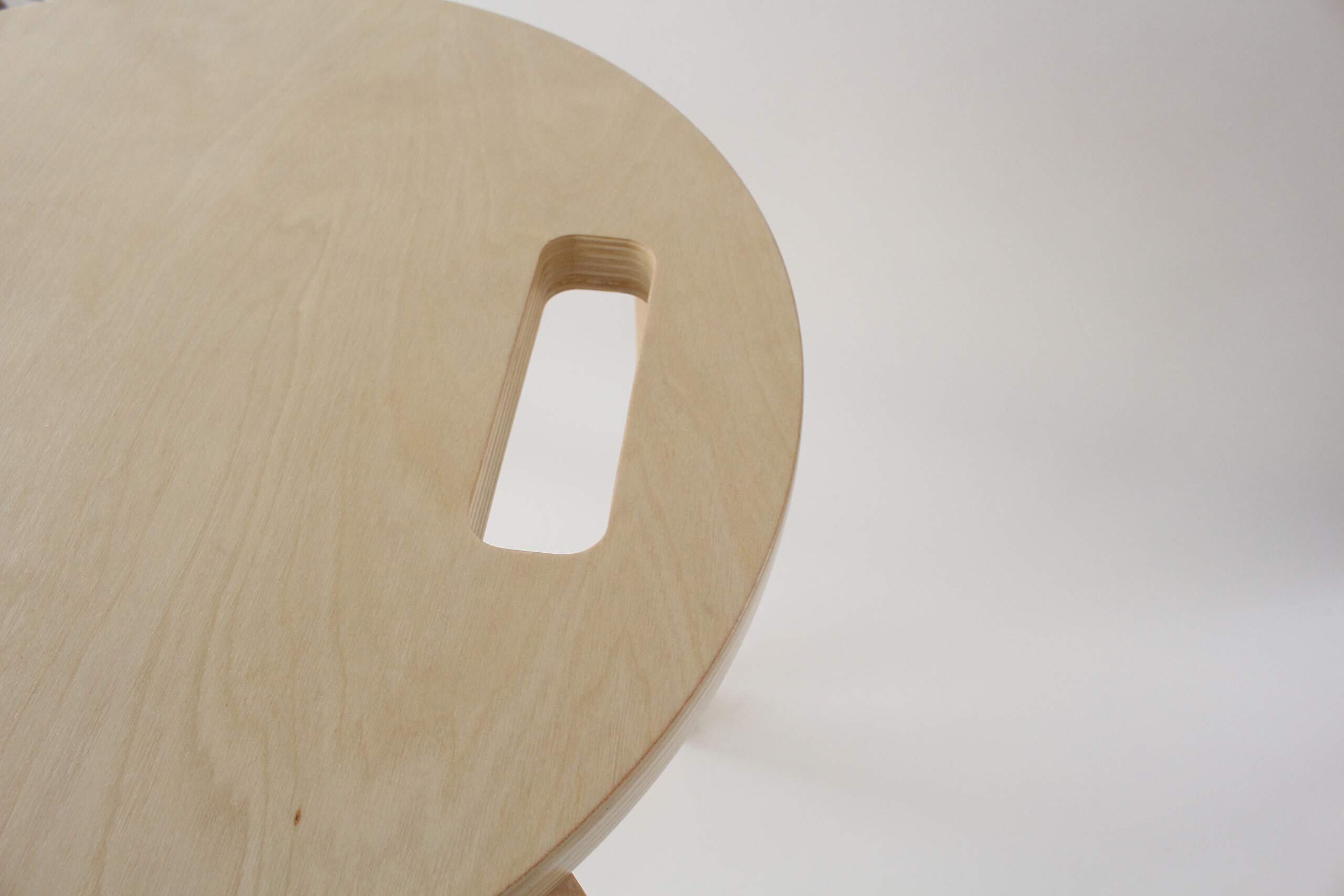 天板にくり抜かれた持ち手は、シンプルなスツールの邪魔をしません。