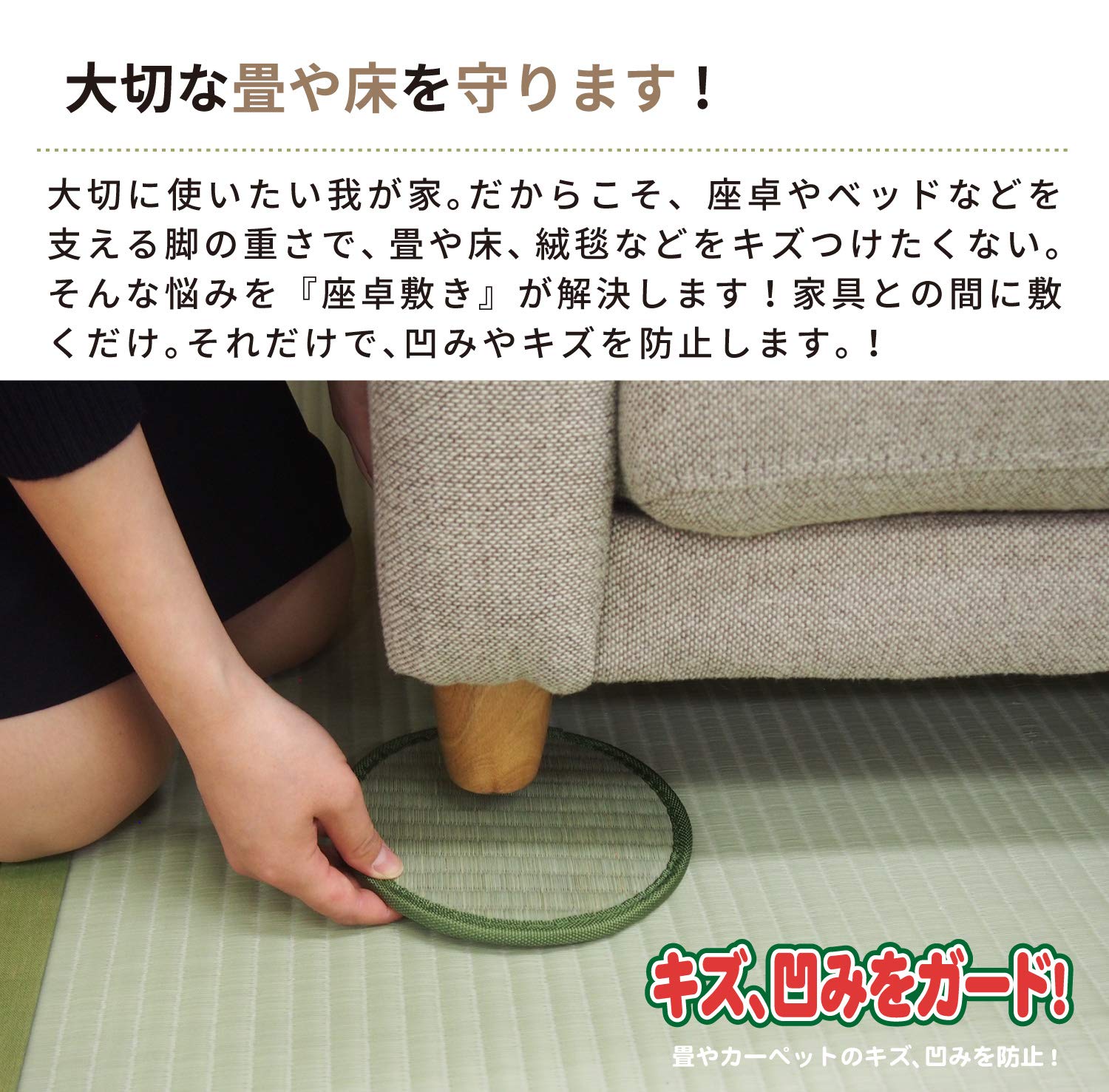 座卓・テーブル・ベッド・ソファなどの下に敷くだけで、畳のへこみや床のキズを防止します。座卓敷きとしてだけではなく、花瓶敷きや小物置きなどとしてもお使いいただけます。