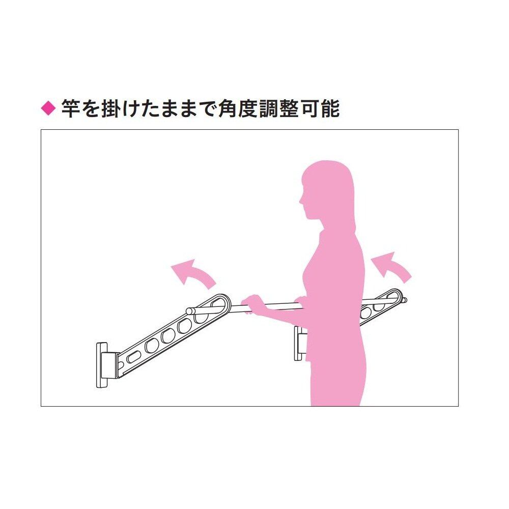 仕様:低い位置に洗濯物が干せる腰壁用物干し。3段活用で角度調節可能(水平-斜め上40°-収納)。収納したときに竿の位置を高く保つことができる「振り上げ収納」を採用。※取付パーツ付属無し。