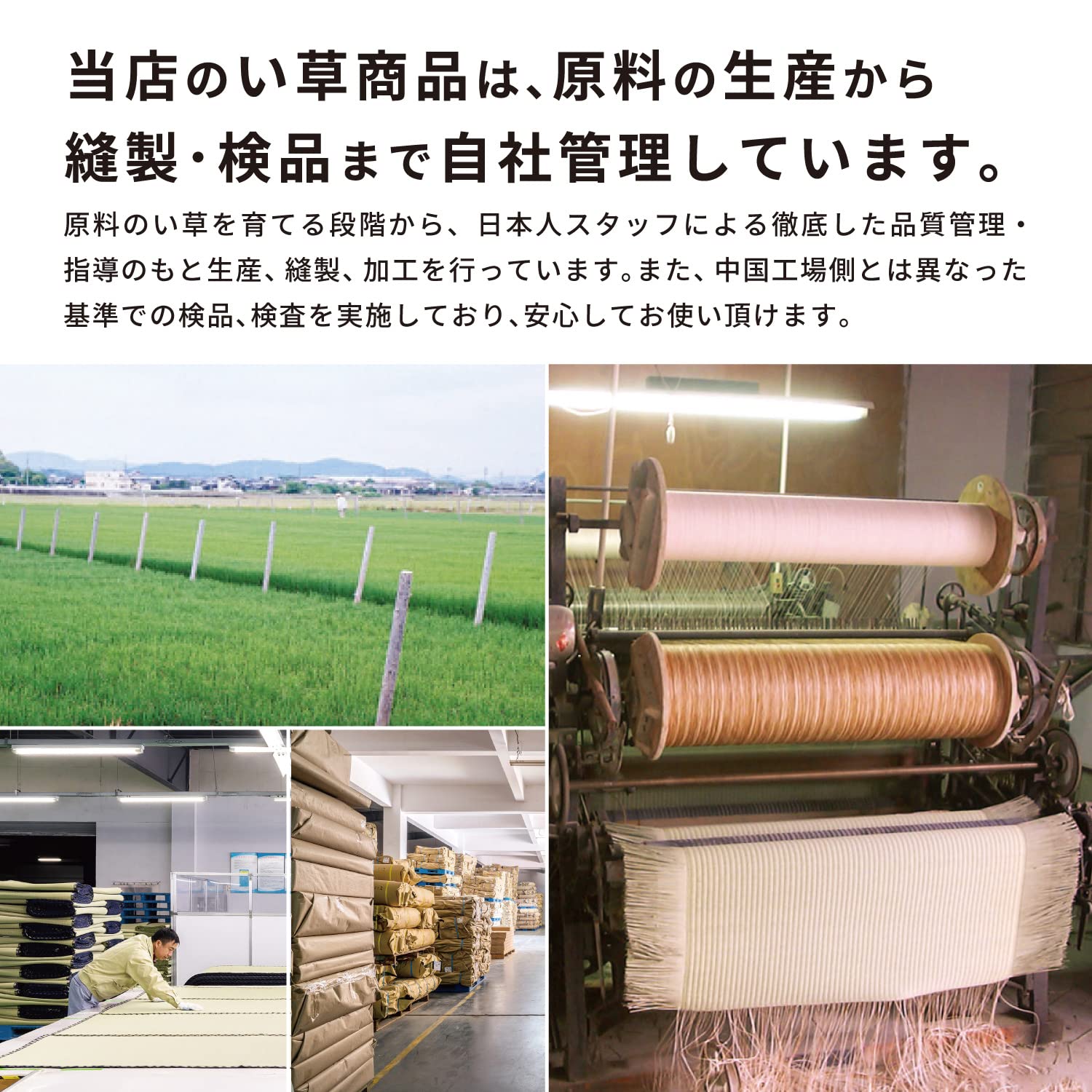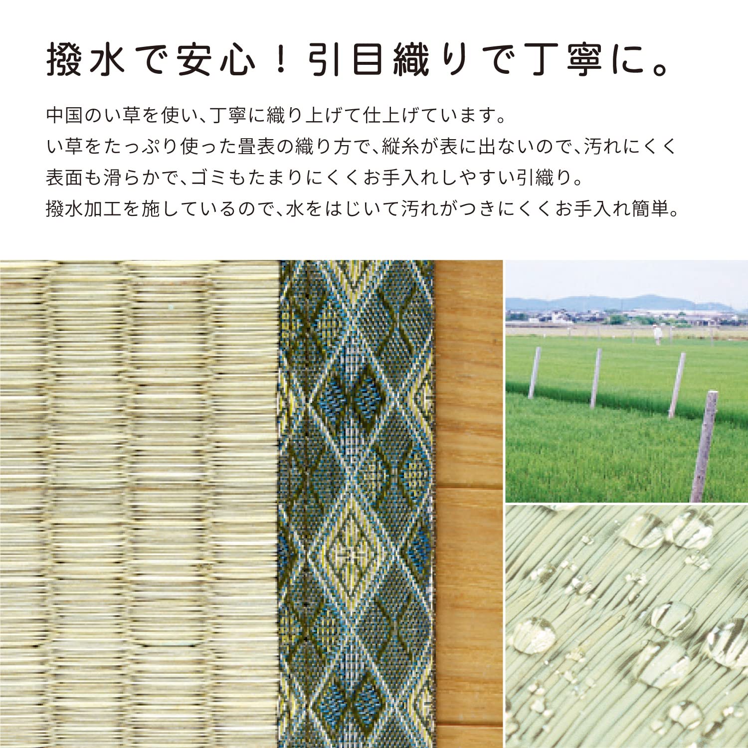 畳と同じ織り方の引目織です。たて糸が表に出ないので、汚れにくく表面も滑らかで、ごみがたまりにくい特徴があります。