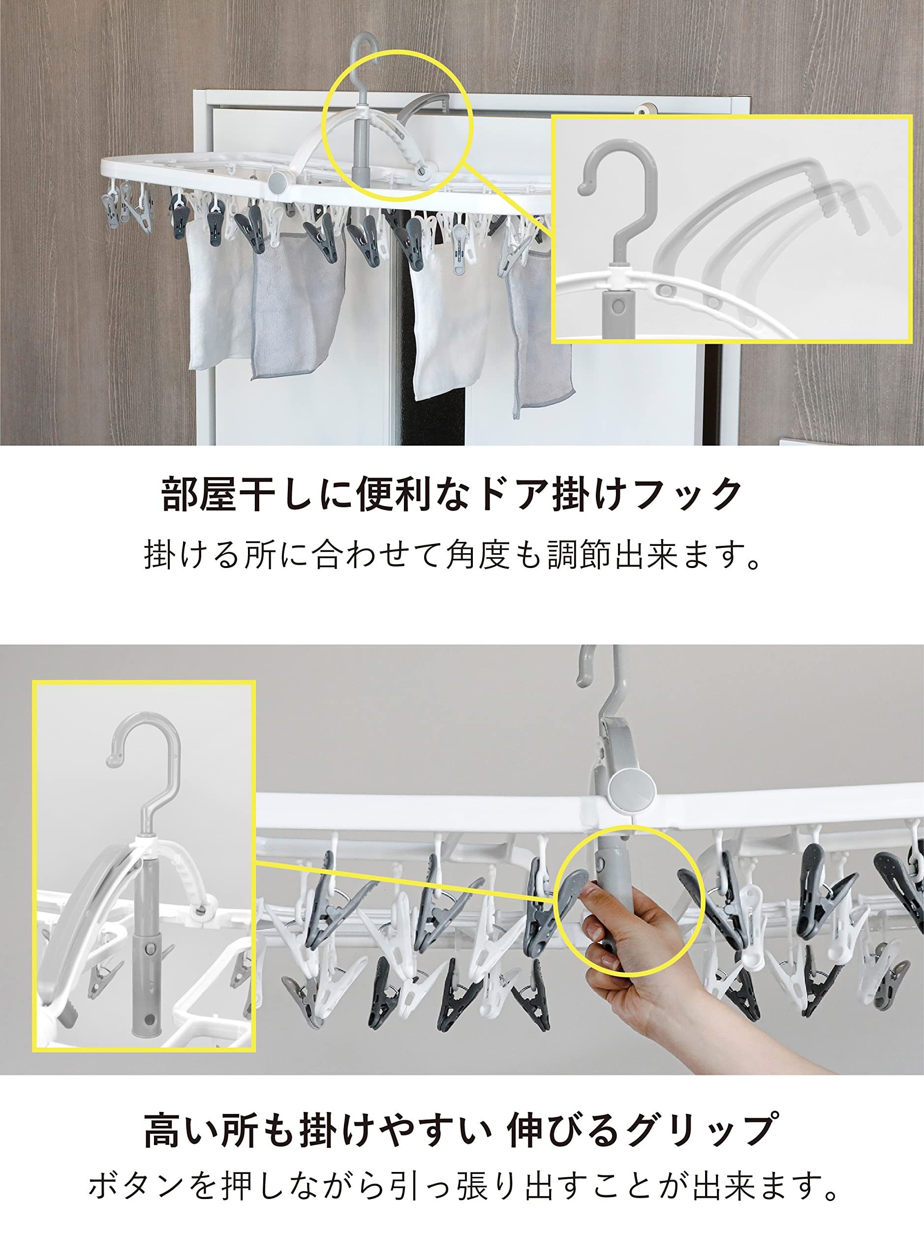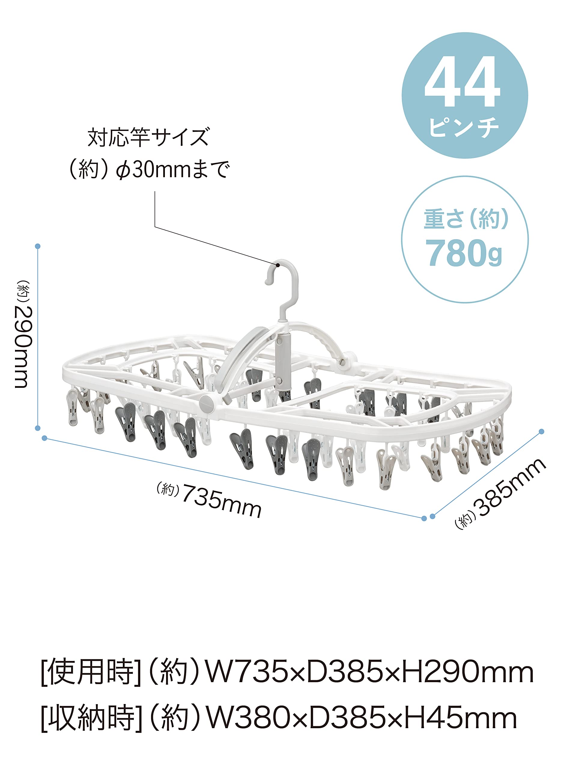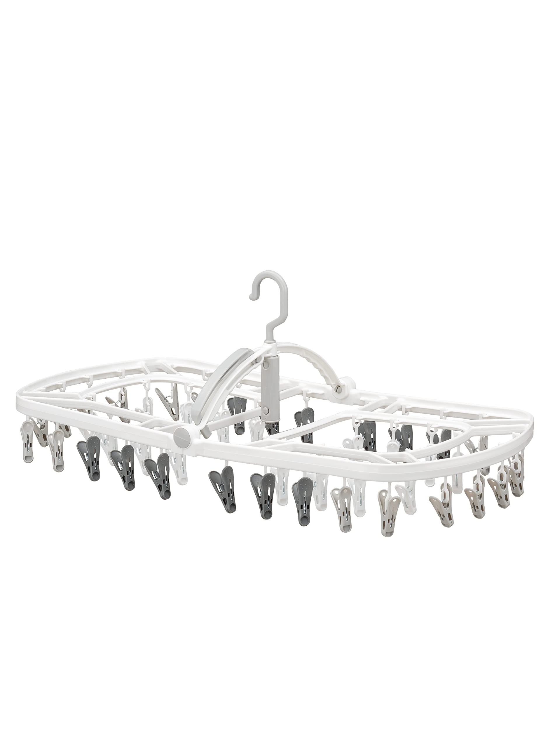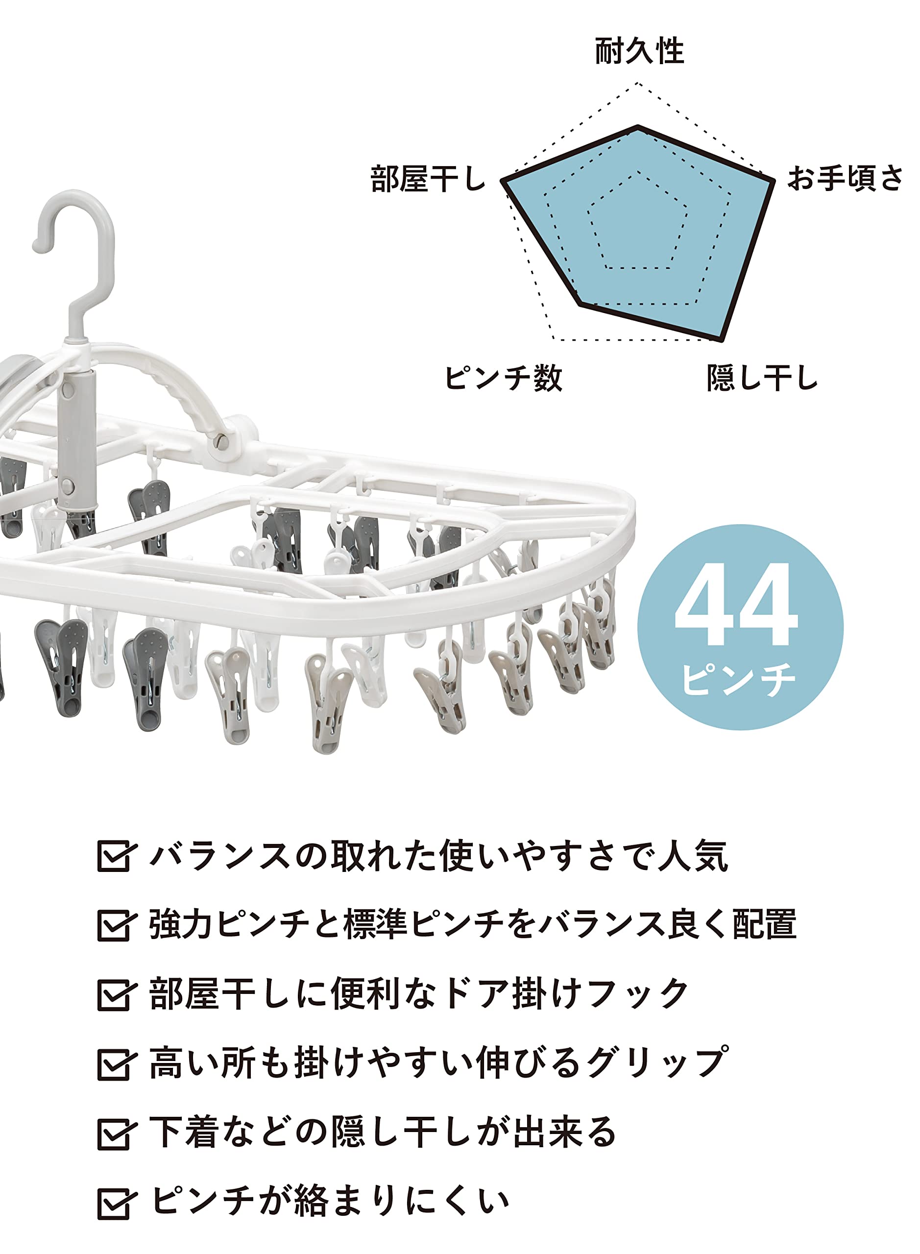 小さすぎずにまとめ干しにもちょうどいい「ランドリーハンガー44ピンチ」ドアなどに引っ掛けられる部屋干しフックが付いているので、日中外出が多い方にもぴったりです。