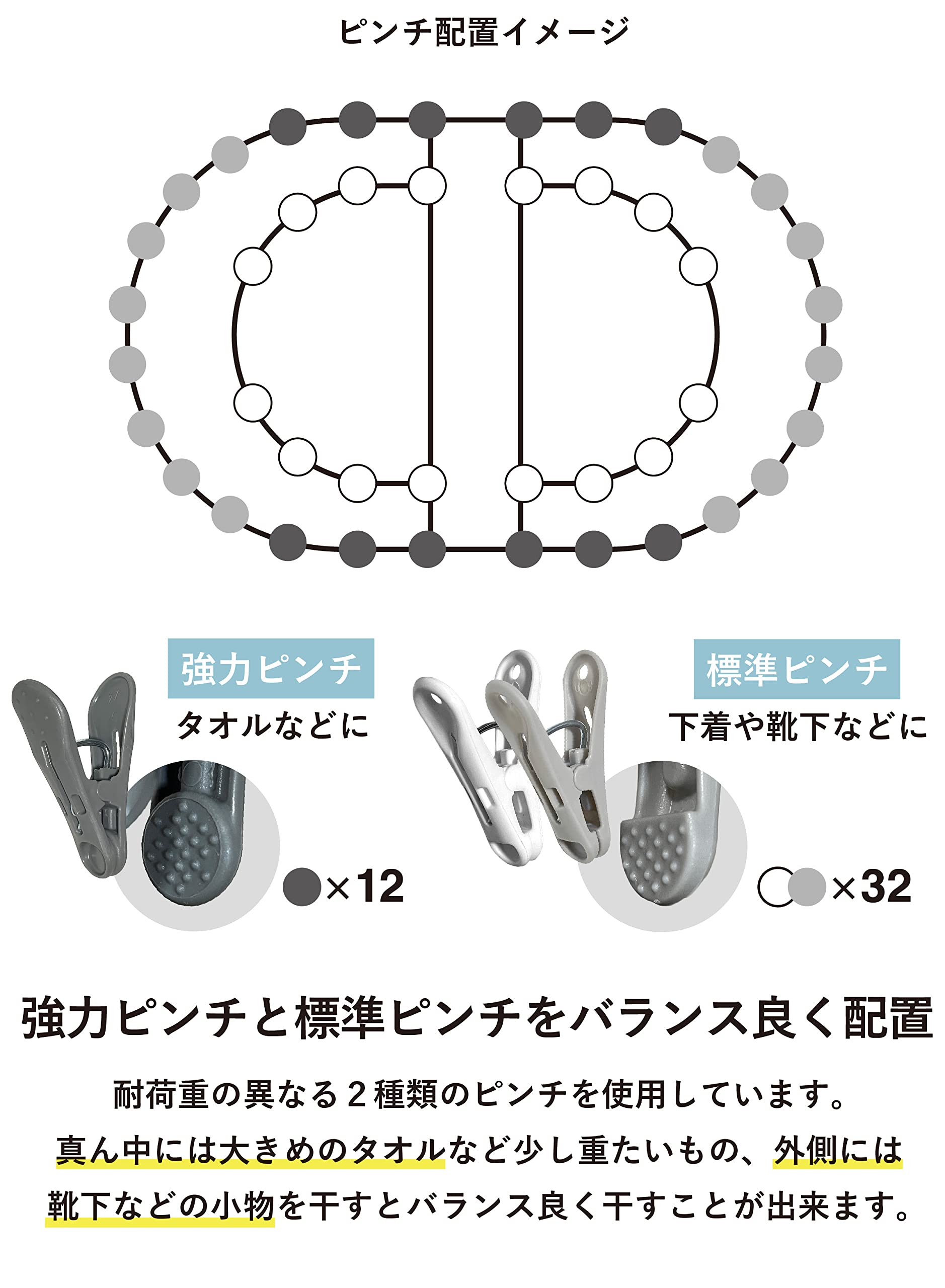 標準ピンチ(ホワイト、ライトグレー)、強力ピンチ(ダークグレー)の2種類のピンチがついています。強力ピンチは挟む面が少し広めになっている分、標準ピンチに比べてつかむ力が強いピンチです。タオルなど少し大きめの洗濯物を干すのに便利です。