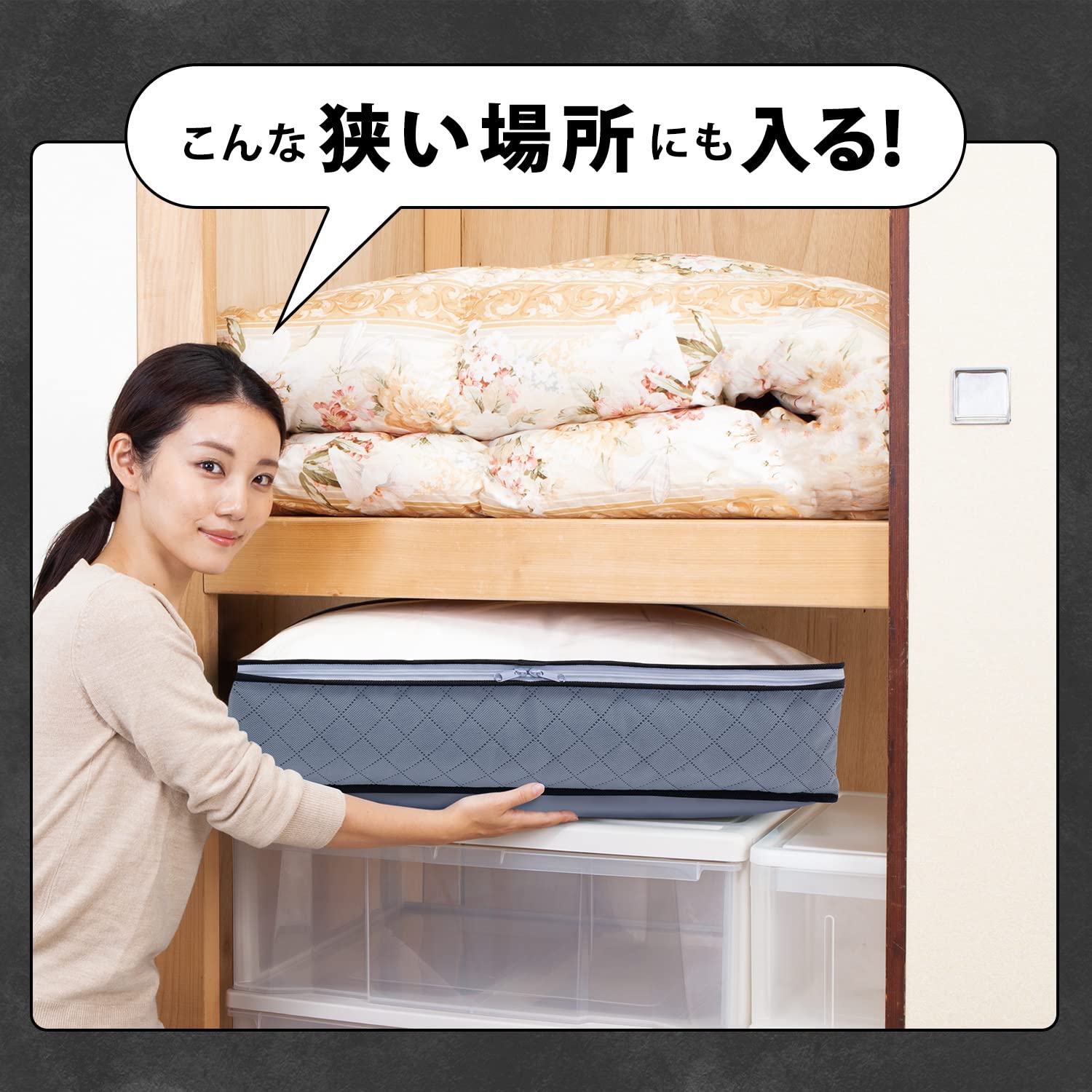【商品仕様】:サイズ/約幅65×奥行50×高さ15cm、内容/1枚、カラー/グレー、収納目安/シングルサイズの羽毛布団1枚、材質/ポリプロピレン・活性炭・ポリエチレン