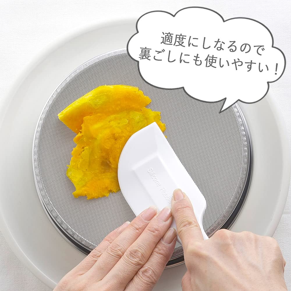 一体成形で食品のカスがつきにくく、衛生的。耐油性・耐熱性に優れたシリコンゴムを使用。材料を混ぜたり、移したりがきれいにできる