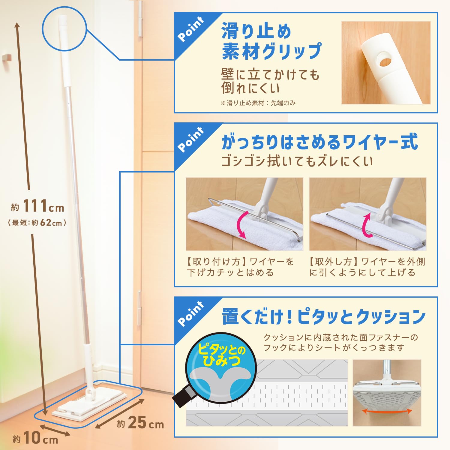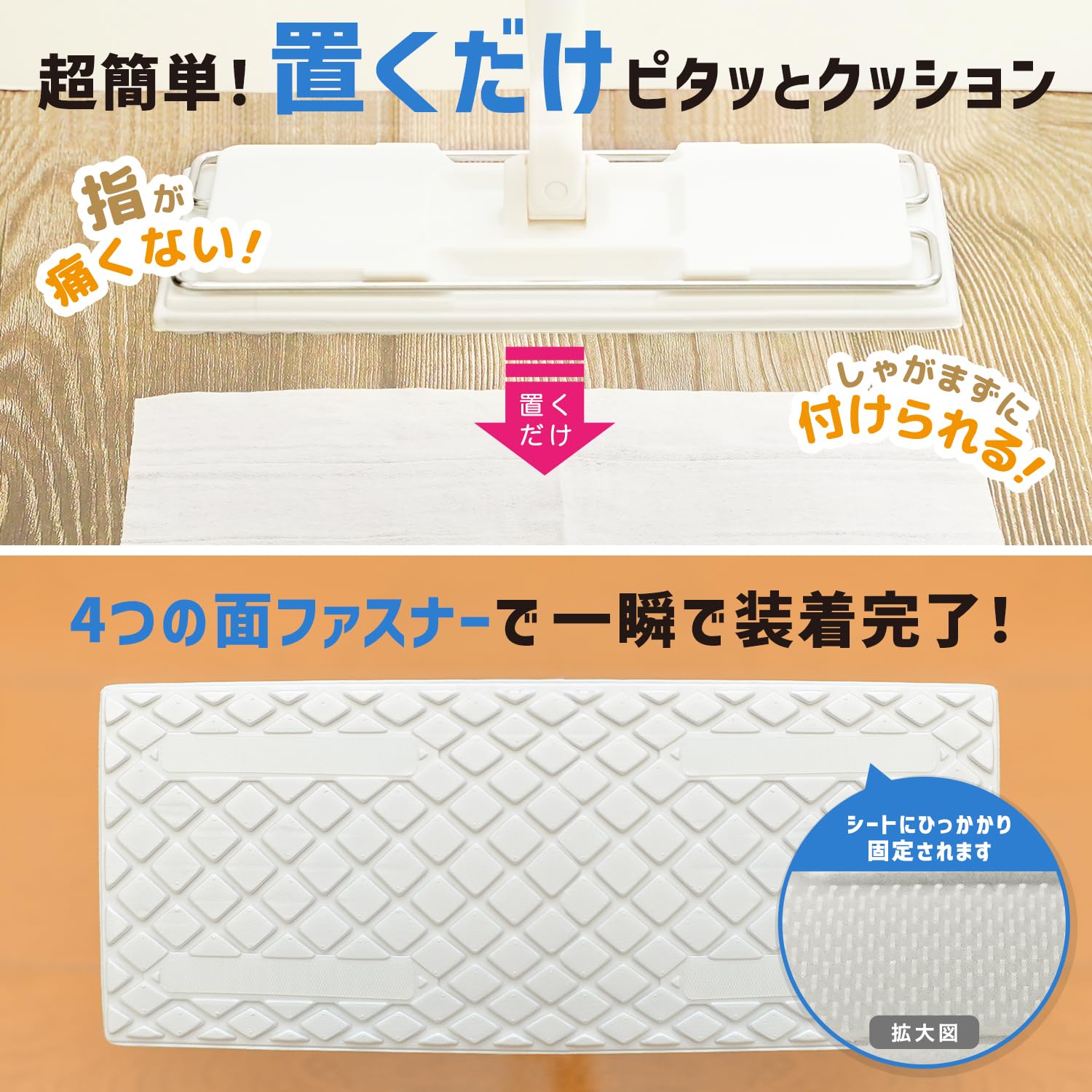 ●がっちりはさめるワイヤーでぞうきん・クロスをしっかり固定でき、シートはヘッドクッションに内臓された面ファスナーで、置くだけで簡単に装着できます。