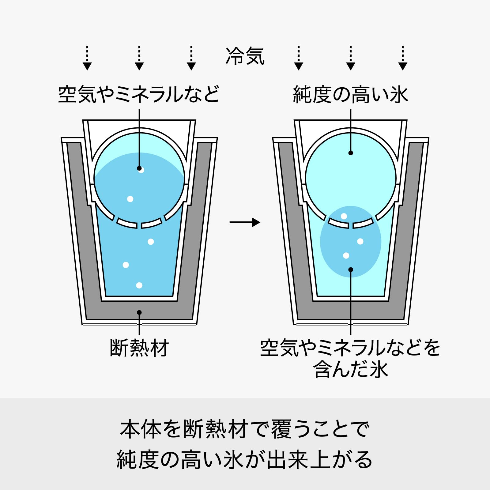 本体を断熱材で覆うことで、製氷時にミネラルを含んだ氷と純度の高い丸氷に分けて製氷。