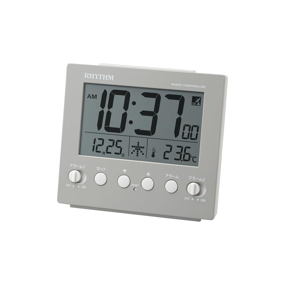 リズム(RHYTHM) 目覚まし時計 電波時計 デジタル 電子音 ダブル アラーム (スヌーズ 付) 温度計 ライト カレンダー グレー 9.1×10×4.5cm フィットウェーブ D236 8RZ236SR08